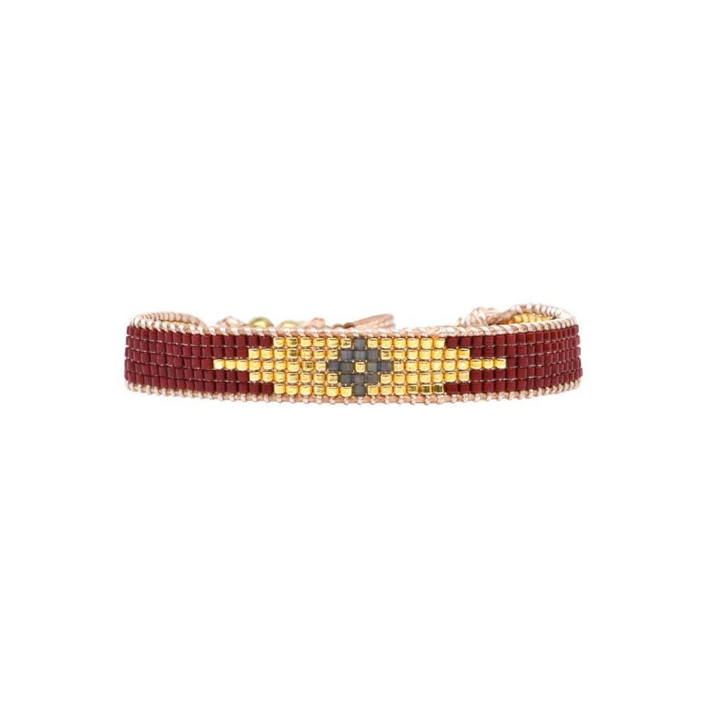 Bracelet Olivia Perles de Miyuki dorées à l’or fin, pépites dorées et cristal. Assortiment des couleurs Anthracite et Acajou (Mahogany enflammé). Bracelet entièrement confectionné à la main de manière artisanale. Chaque bijou de la marque est livré dans un pochon spécifique.
