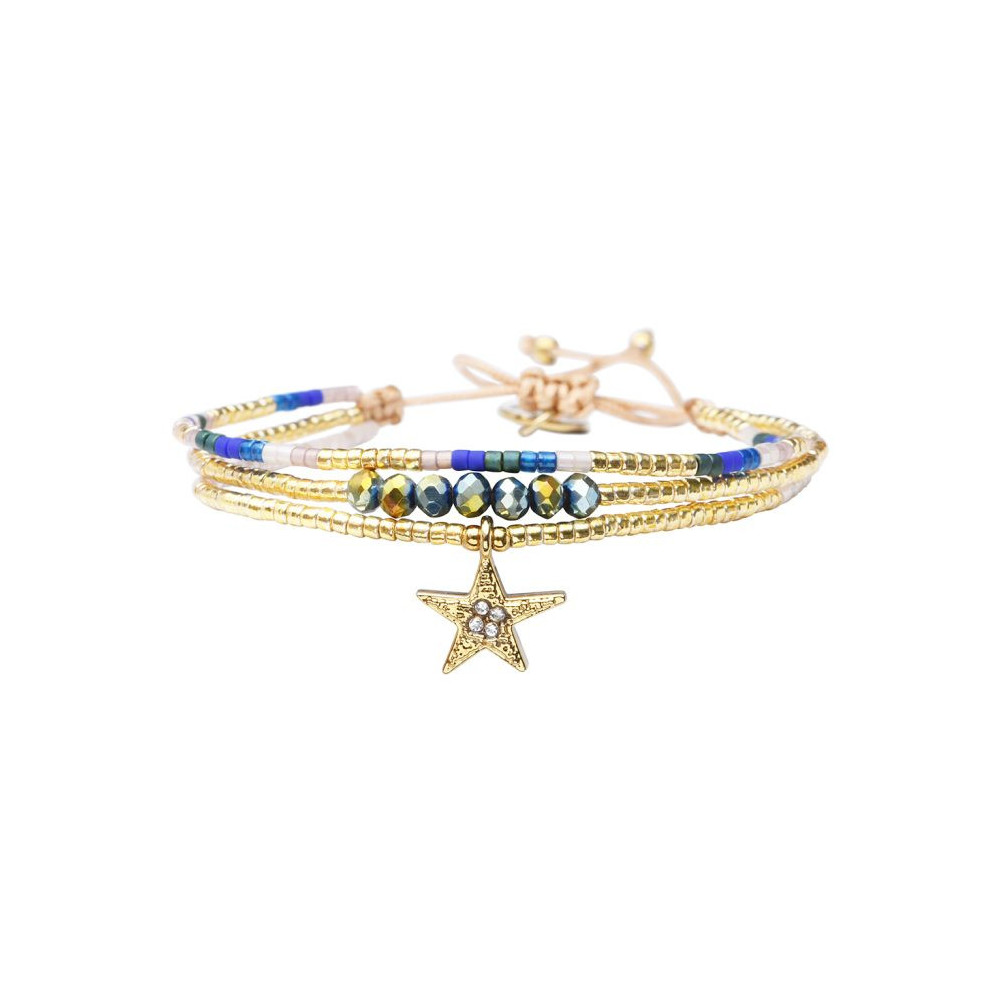 Bracelet Elsa Perles de Miyuki dorées à l’or fin, pépites dorées et cristal. Assortiment des couleurs Nuage de lait - Bleu Roi - Metalic Blue - Vert Iris. Bracelet entièrement confectionné à la main de manière artisanale. Chaque bijou de la marque est livré dans un pochon spécifique.