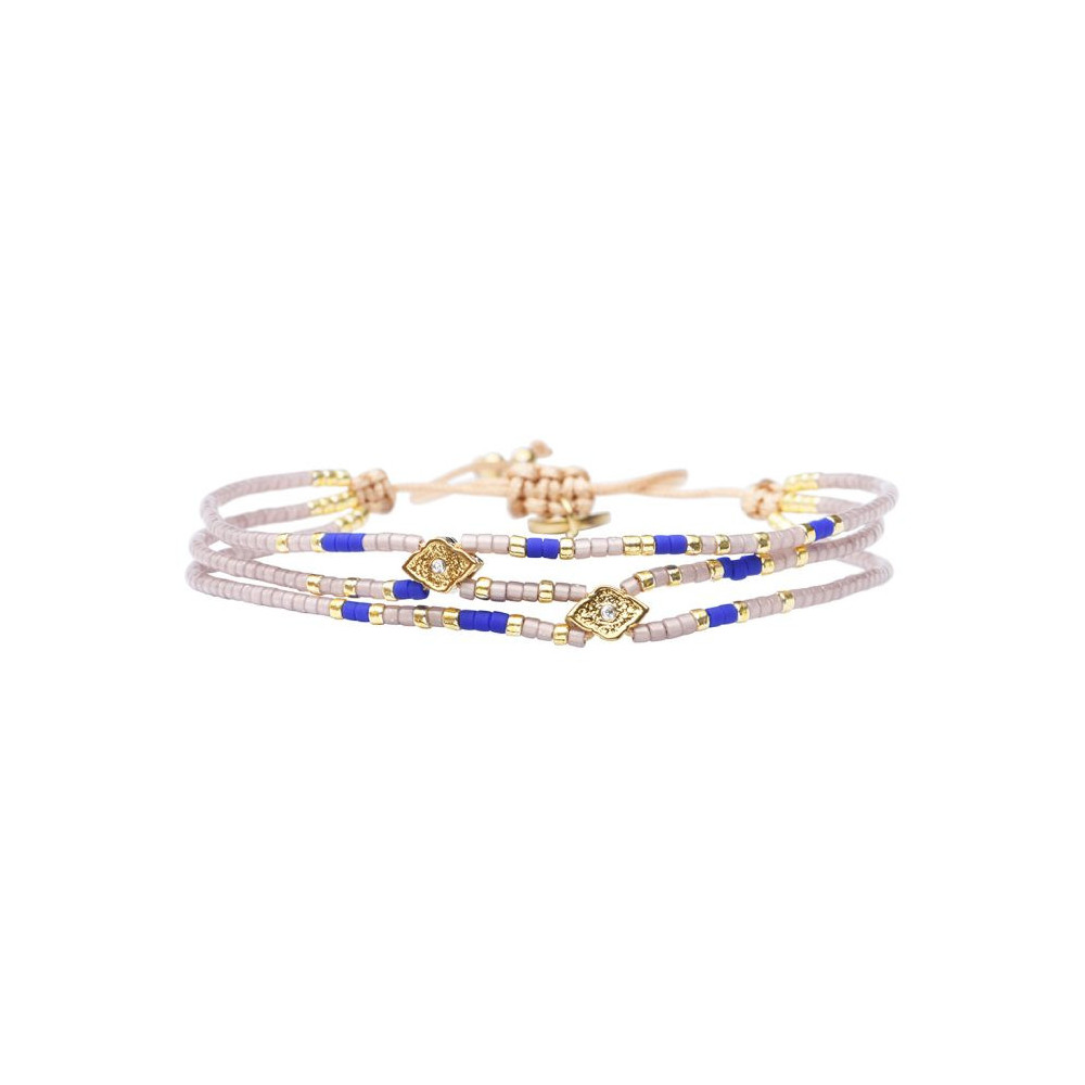 Bracelet Uma Perles de Miyuki dorées à l’or fin, pépites dorées et cristal. Assortiment des couleurs Nuage de lait - Bleu Roi - Metalic Blue - Vert Iris. Bracelet entièrement confectionné à la main de manière artisanale. Chaque bijou de la marque est livré dans un pochon spécifique.