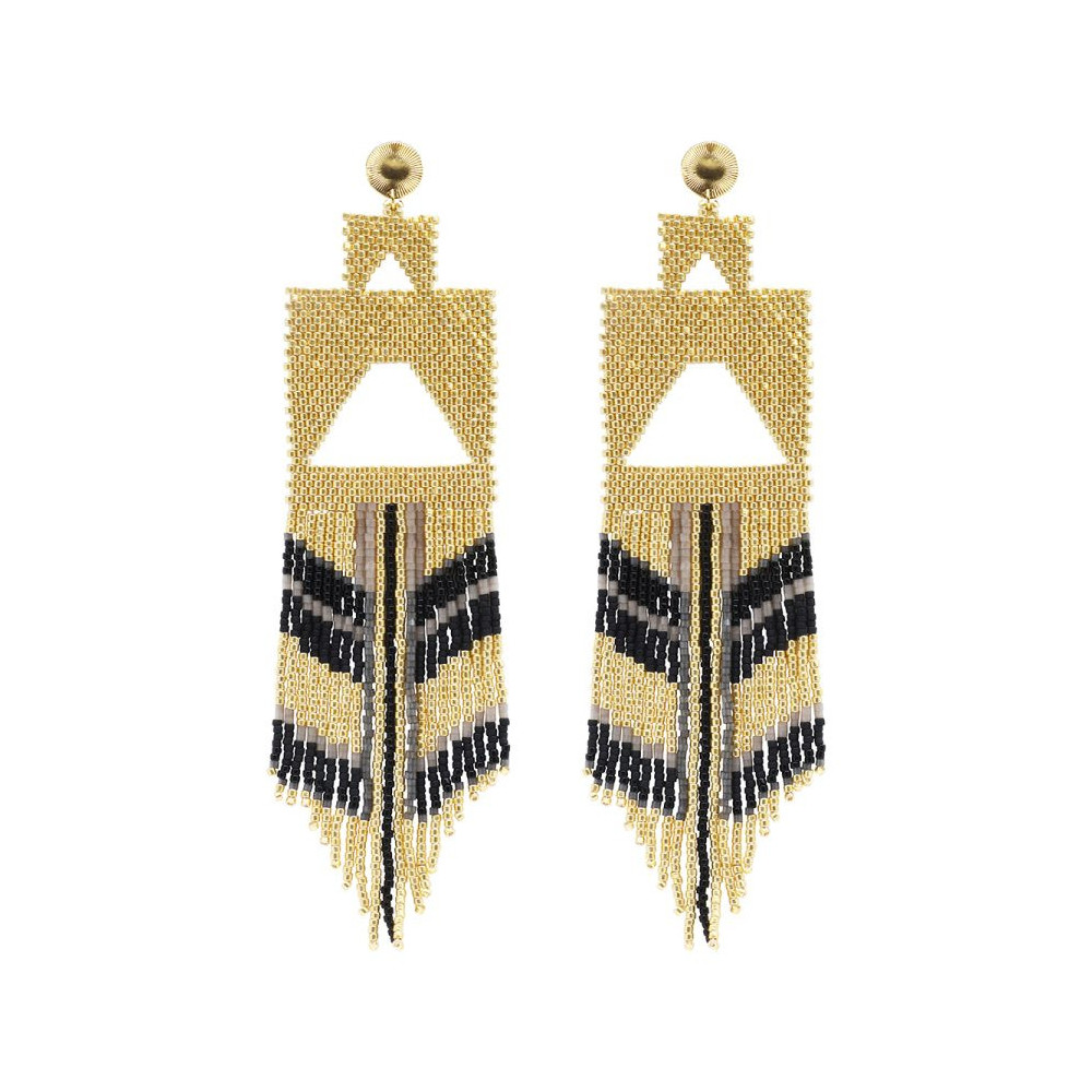 Boucles d'oreilles Serena Perles de Miyuki dorées à l’or fin, pépites dorées et cristal noir. Entièrement confectionné à la main de manière artisanale, chaque bijou de la marque est livré dans un pochon spécifique.