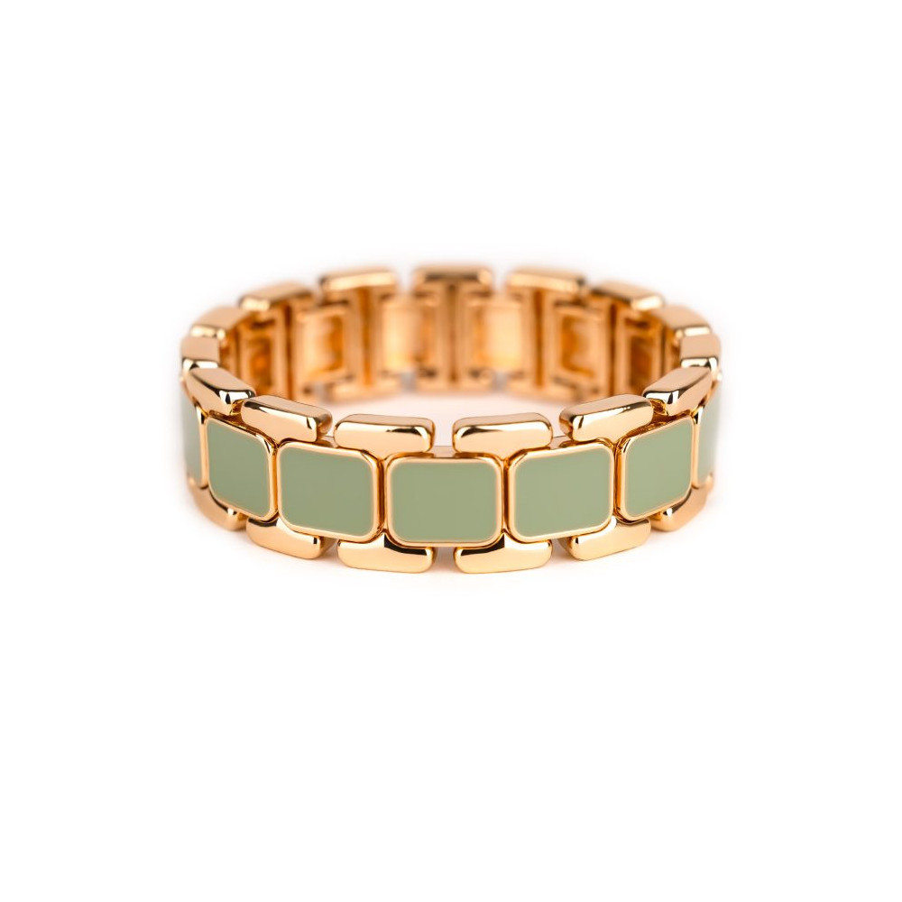 Bracelet Tempo Sauge Moyen monté sur élastique multibrins ou unibrin, composé d'éléments en métal émaillé, de laiton doré et pour certains de strass en zirconium. Chaque bijou de la marque est livré dans son pochon spécifique griffé Simone à Bordeaux.