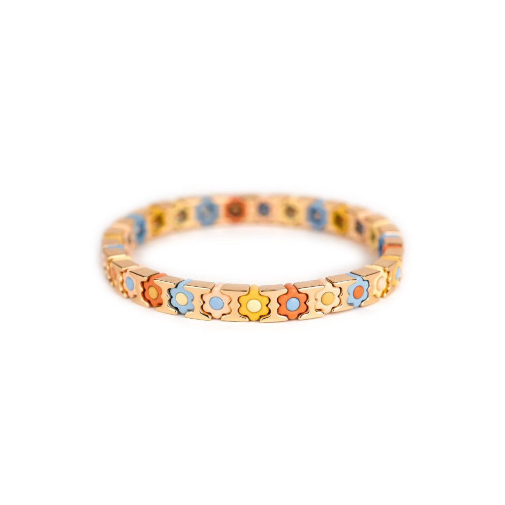 Bracelet Coachella Mini Dune Moyen monté sur élastique multibrins ou unibrin, composé d'éléments en métal émaillé, de laiton doré et pour certains de strass en zirconium. Chaque bijou de la marque est livré dans son pochon spécifique griffé Simone à Bordeaux.