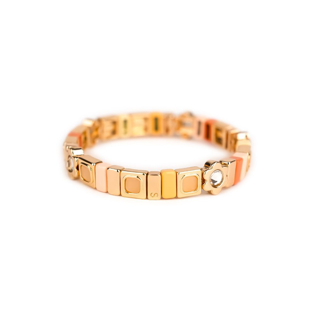 Bracelet Coachella Ethnique Dune Moyen monté sur élastique multibrins ou unibrin, composé d'éléments en métal émaillé, de laiton doré et pour certains de strass en zirconium. Chaque bijou de la marque est livré dans son pochon spécifique griffé Simone à Bordeaux.