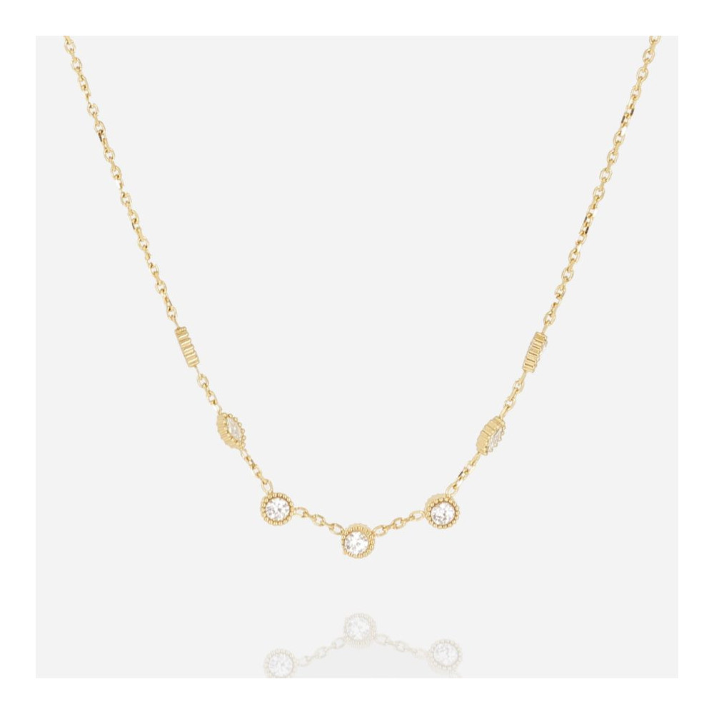 COLLIER–Papanice–ACIER DORE–zirconium–38+2+2cm. Chaque bijou de la marque est livré dans son pochon spécifique griffé Zag.