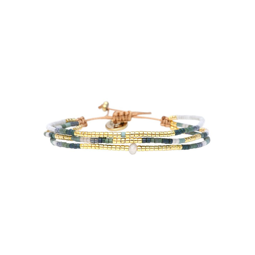 Bracelet Agathe composé de perles de miyuki dorées - vert céladon - vert mat imperial métalisé - bleu délicat pastel - émeraude lustré - blanc soie de pêche. Bracelet entièrement confectionné à la main de manière artisanale. Fermoir lien coulissant, ajustable à tous les poignet (14 à 24 cm). Chaque bijou de la marque est livré dans un pochon spécifique.