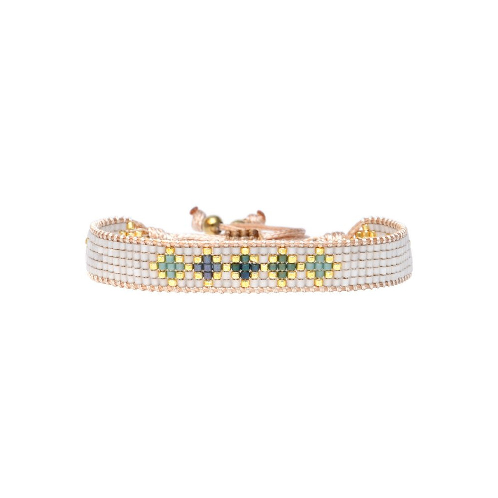 Bracelet Alba composé de perles de miyuki dorées - vert céladon - vert mat imperial métalisé - bleu délicat pastel - émeraude lustré - blanc soie de pêche. Bracelet entièrement confectionné à la main de manière artisanale. Fermoir lien coulissant, ajustable à tous les poignet (14 à 24 cm). Chaque bijou de la marque est livré dans un pochon spécifique.
