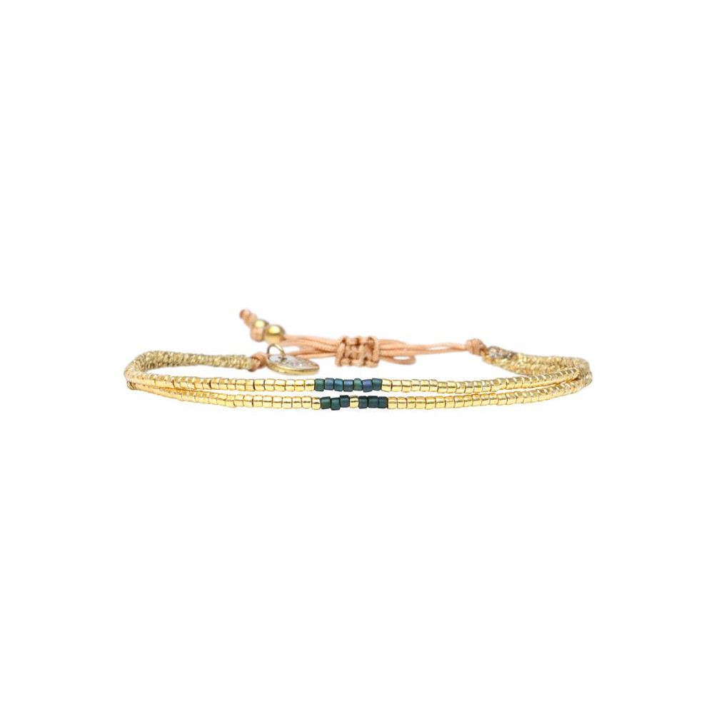 Bracelet Lya composé de perles de miyuki dorées - vert céladon - vert mat imperial métalisé - bleu délicat pastel - émeraude lustré - blanc soie de pêche. Bracelet entièrement confectionné à la main de manière artisanale. Fermoir lien coulissant, ajustable à tous les poignet (14 à 24 cm). Chaque bijou de la marque est livré dans un pochon spécifique.