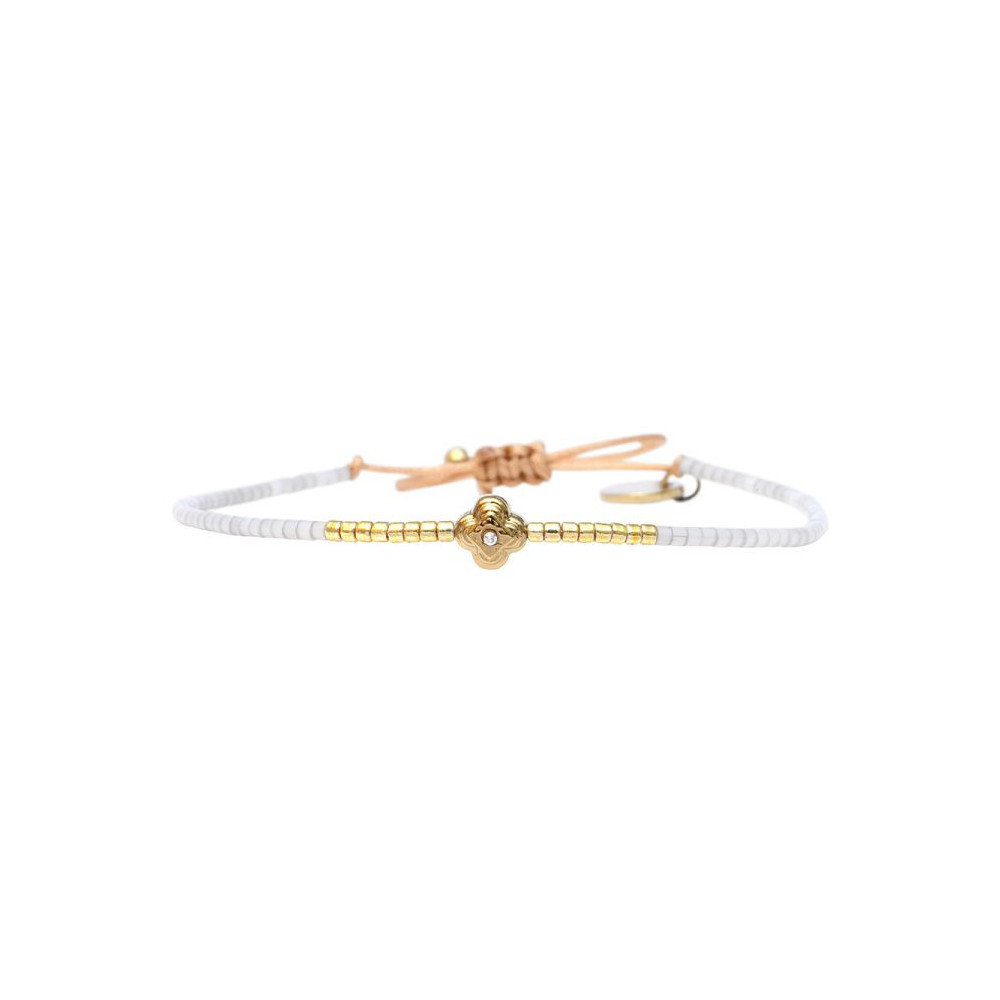 Bracelet Marie composé de perles de miyuki dorées - blanc soie de pêche. Bracelet entièrement confectionné à la main de manière artisanale. Fermoir lien coulissant, ajustable à tous les poignet (14 à 24 cm). Chaque bijou de la marque est livré dans un pochon spécifique.
