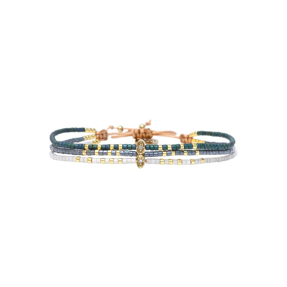 Bracelet Lola composé de perles de miyuki dorées - vert céladon - vert mat imperial métalisé - bleu délicat pastel - émeraude lustré - blanc soie de pêche. Bracelet entièrement confectionné à la main de manière artisanale. Fermoir lien coulissant, ajustable à tous les poignet (14 à 24 cm). Chaque bijou de la marque est livré dans un pochon spécifique.