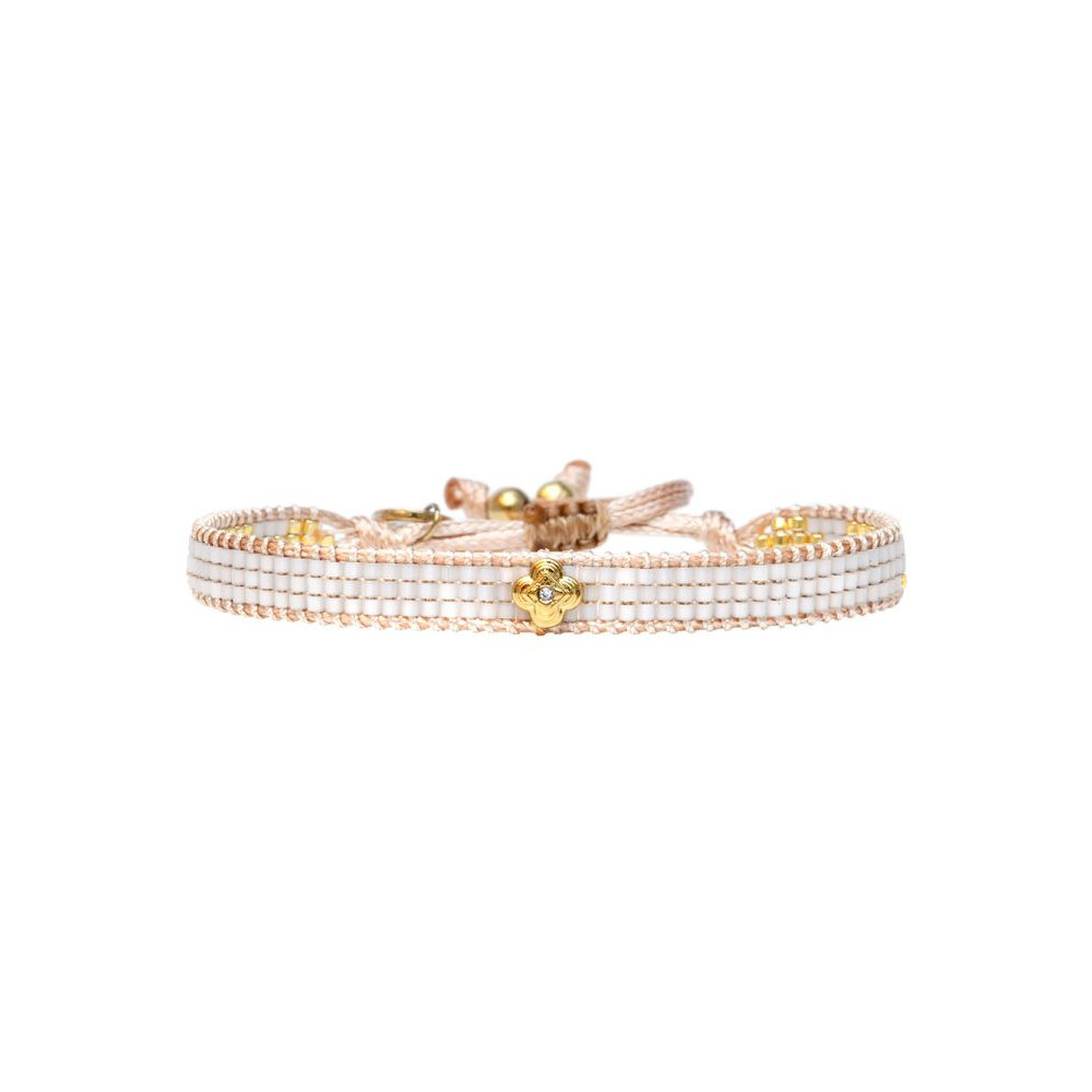 Bracelet Lily composé de perles de miyuki dorées - blanc soie de pêche. Bracelet entièrement confectionné à la main de manière artisanale. Fermoir lien coulissant, ajustable à tous les poignet (14 à 24 cm). Chaque bijou de la marque est livré dans un pochon spécifique.