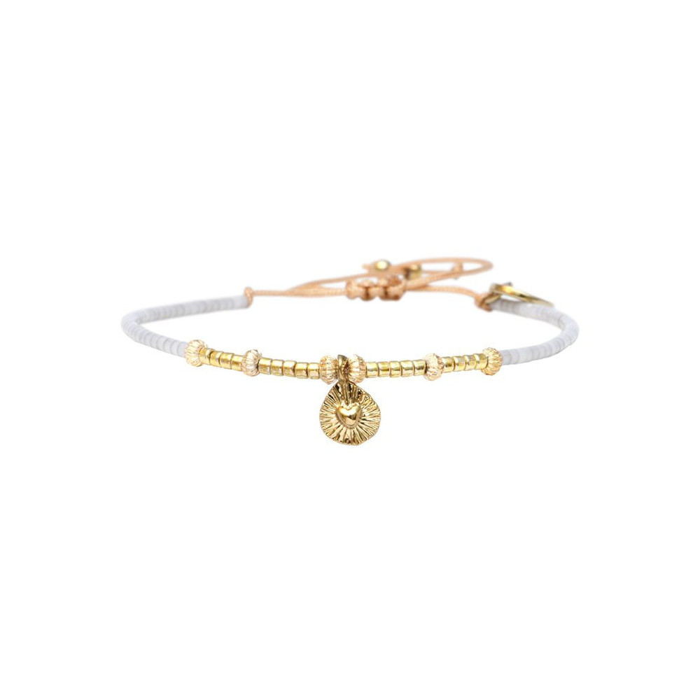 Bracelet Sandy composé de perles de miyuki dorées - blanc soie de pêche. Bracelet entièrement confectionné à la main de manière artisanale. Fermoir lien coulissant, ajustable à tous les poignet (14 à 24 cm). Chaque bijou de la marque est livré dans un pochon spécifique.