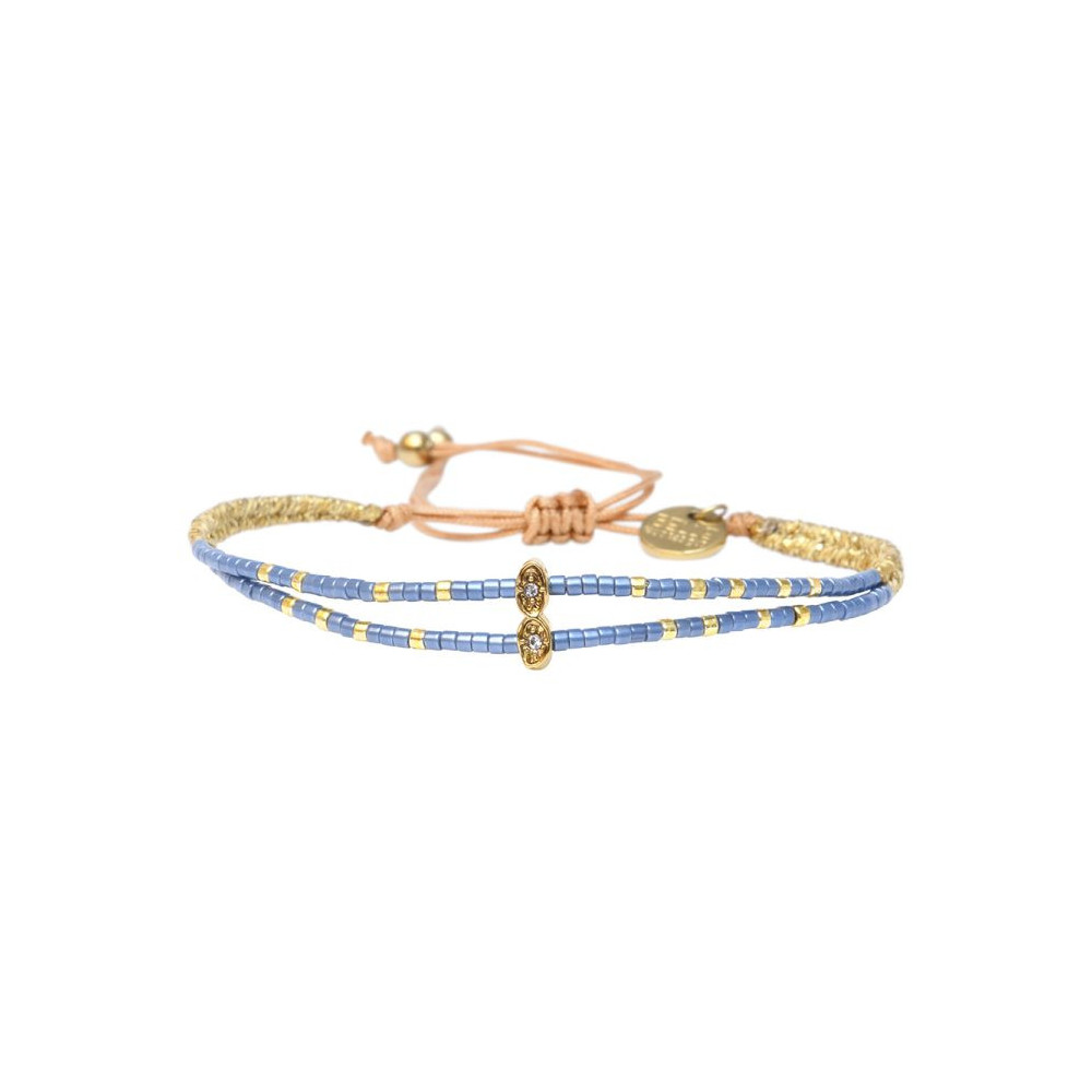Bracelet Ella composé de perles de miyuki dorées - bleu sortie en mer. Bracelet entièrement confectionné à la main de manière artisanale. Fermoir lien coulissant, ajustable à tous les poignet (14 à 24 cm). Chaque bijou de la marque est livré dans un pochon spécifique.