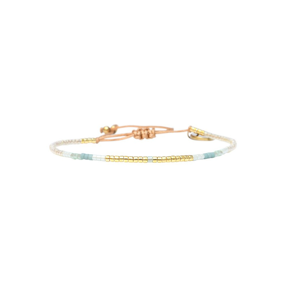 Bracelet Alice composé de perles de miyuki dorées - cristal de roche - vert flâner au jardin - vert détente au spa - vert d'eau. Bracelet entièrement confectionné à la main de manière artisanale. Fermoir lien coulissant, ajustable à tous les poignet (14 à 24 cm). Chaque bijou de la marque est livré dans un pochon spécifique.