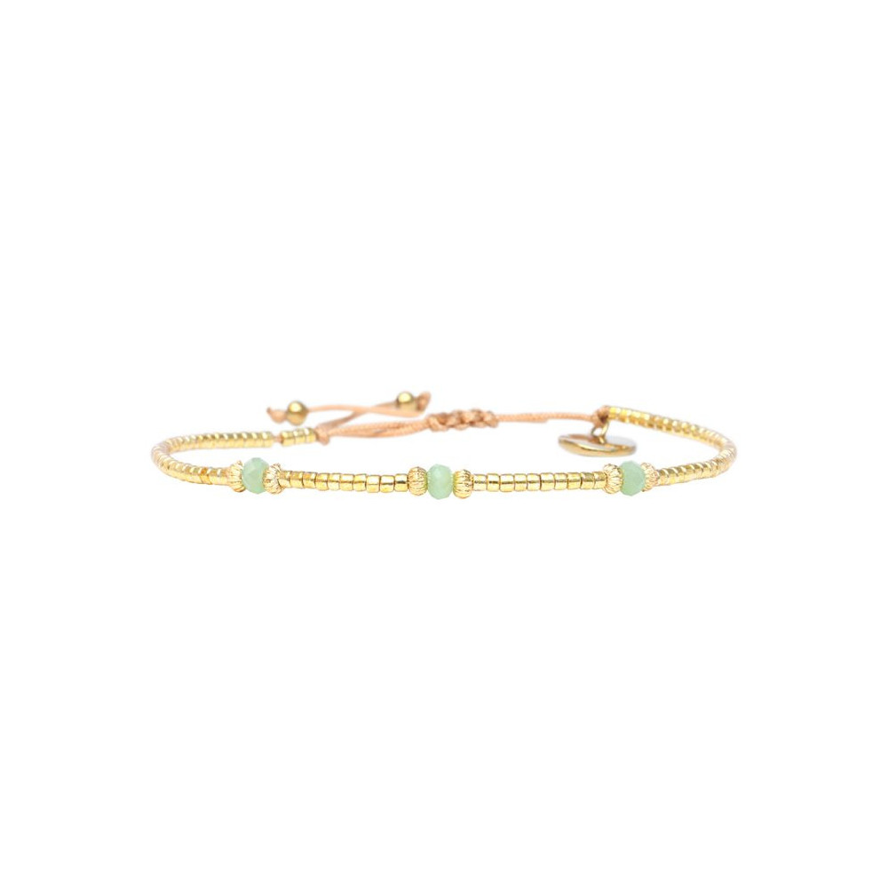 Bracelet Nina composé de perles de miyuki dorées - cristal vert de jade. Bracelet entièrement confectionné à la main de manière artisanale. Fermoir lien coulissant, ajustable à tous les poignet (14 à 24 cm). Chaque bijou de la marque est livré dans un pochon spécifique.