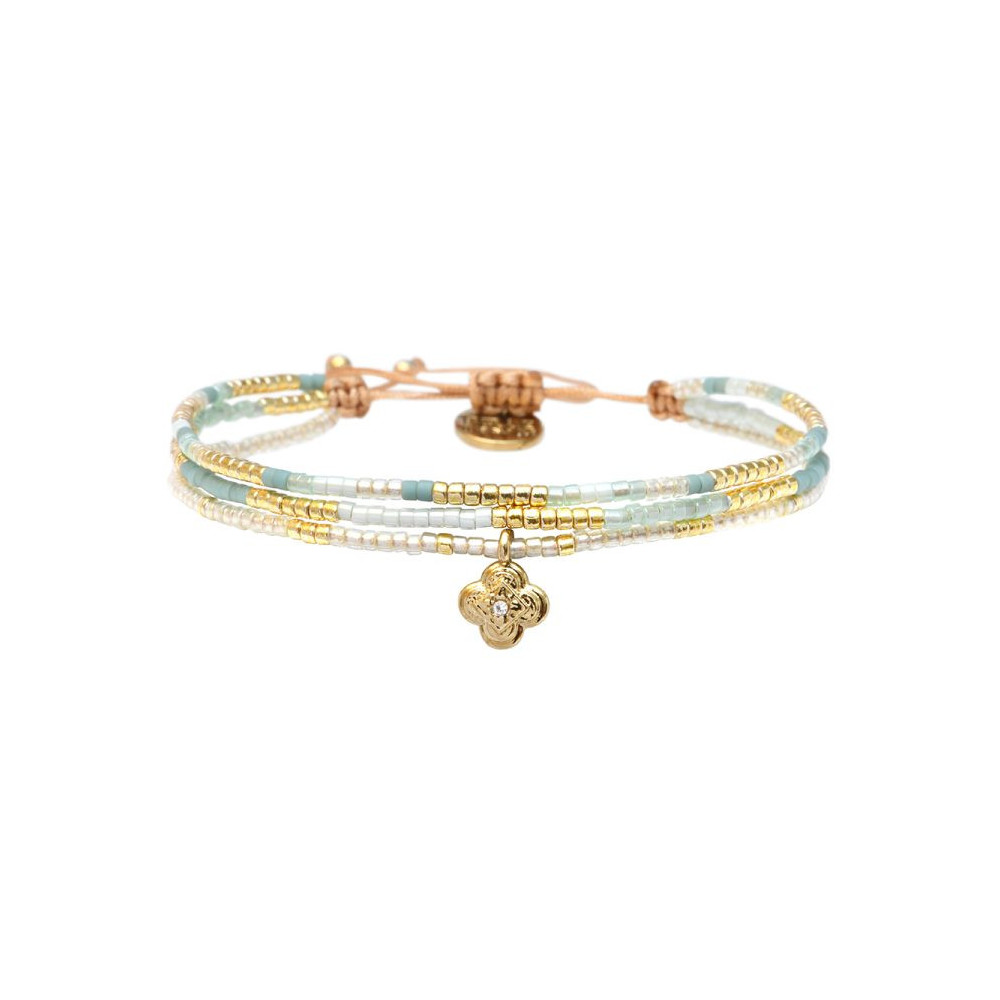 Bracelet Jeanne composé de perles de miyuki dorées - cristal de roche - vert flâner au jardin - vert détente au spa - vert d'eau. Bracelet entièrement confectionné à la main de manière artisanale. Fermoir lien coulissant, ajustable à tous les poignet (14 à 24 cm). Chaque bijou de la marque est livré dans un pochon spécifique.