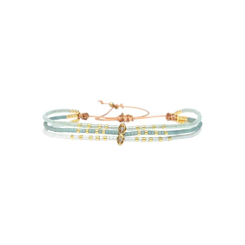 Bracelet Lola composé de perles de miyuki dorées - vert flâner au jardin - vert détente au spa - vert d'eau. Bracelet entièrement confectionné à la main de manière artisanale. Fermoir lien coulissant, ajustable à tous les poignet (14 à 24 cm). Chaque bijou de la marque est livré dans un pochon spécifique.