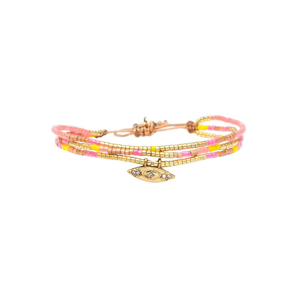 Bracelet Lise composé de perles de miyuki dorées - jaune journée ensoleillée - rose terracotta - satin de soie topaze - rose fluo south beach - pêche melba. Bracelet entièrement confectionné à la main de manière artisanale. Fermoir lien coulissant, ajustable à tous les poignet (14 à 24 cm). Chaque bijou de la marque est livré dans un pochon spécifique.