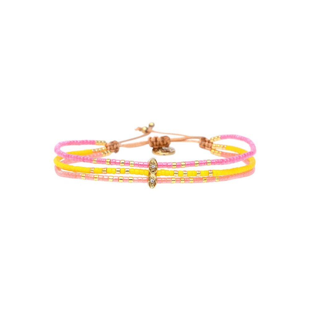 Bracelet Lola composé de perles de miyuki dorées - jaune journée ensoleillée - rose fluo south beach - pêche melba. Bracelet entièrement confectionné à la main de manière artisanale. Fermoir lien coulissant, ajustable à tous les poignet (14 à 24 cm). Chaque bijou de la marque est livré dans un pochon spécifique.