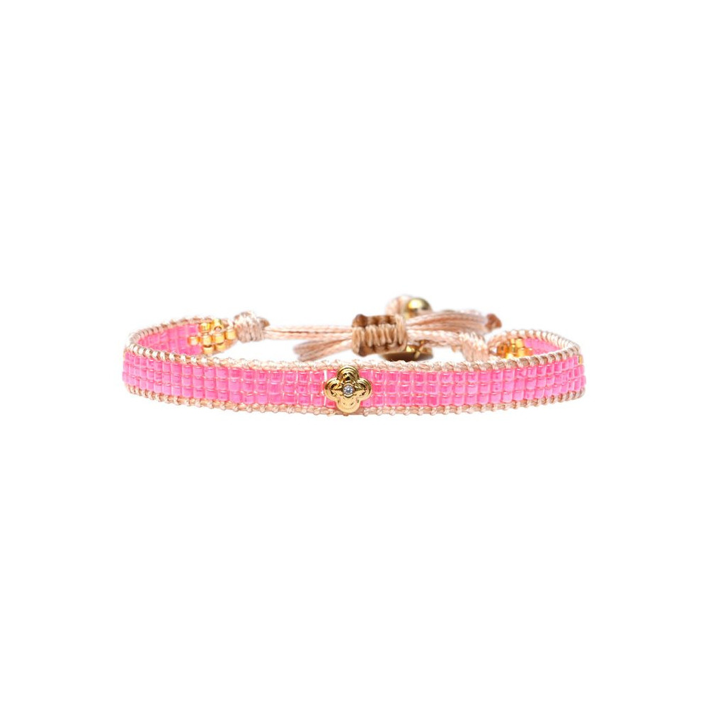 Bracelet Lily composé de perles de miyuki dorées - rose fluo south beach. Bracelet entièrement confectionné à la main de manière artisanale. Fermoir lien coulissant, ajustable à tous les poignet (14 à 24 cm). Chaque bijou de la marque est livré dans un pochon spécifique.