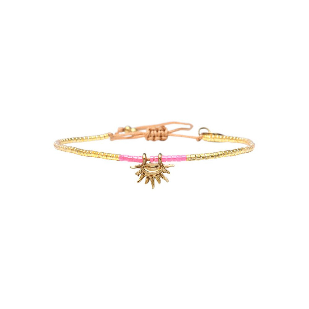 Bracelet Livia composé de perles de miyuki dorées - rose fluo south beach. Bracelet entièrement confectionné à la main de manière artisanale. Fermoir lien coulissant, ajustable à tous les poignet (14 à 24 cm). Chaque bijou de la marque est livré dans un pochon spécifique.