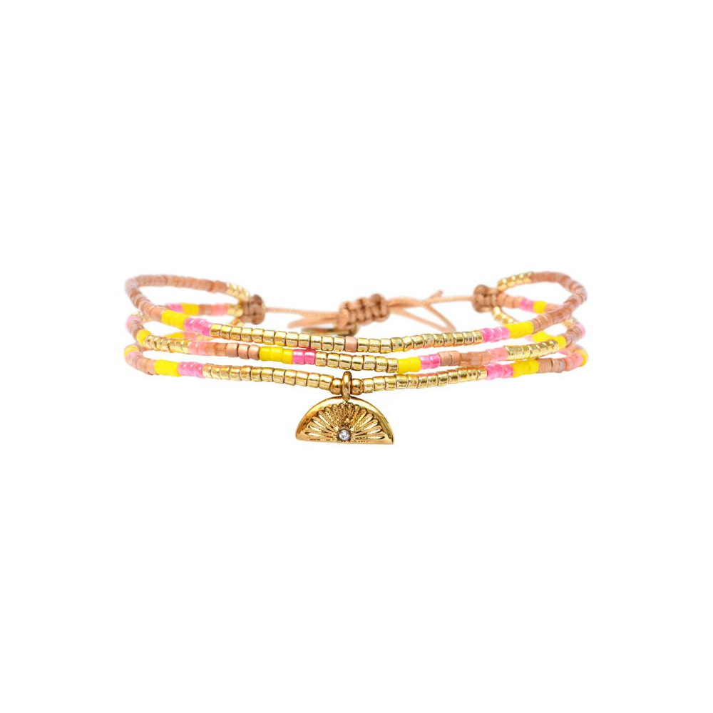 Bracelet Clémence composé de perles de miyuki dorées - jaune journée ensoleillée - rose terracotta - satin de soie topaze - rose fluo south beach - pêche melba. Bracelet entièrement confectionné à la main de manière artisanale. Fermoir lien coulissant, ajustable à tous les poignet (14 à 24 cm). Chaque bijou de la marque est livré dans un pochon spécifique.