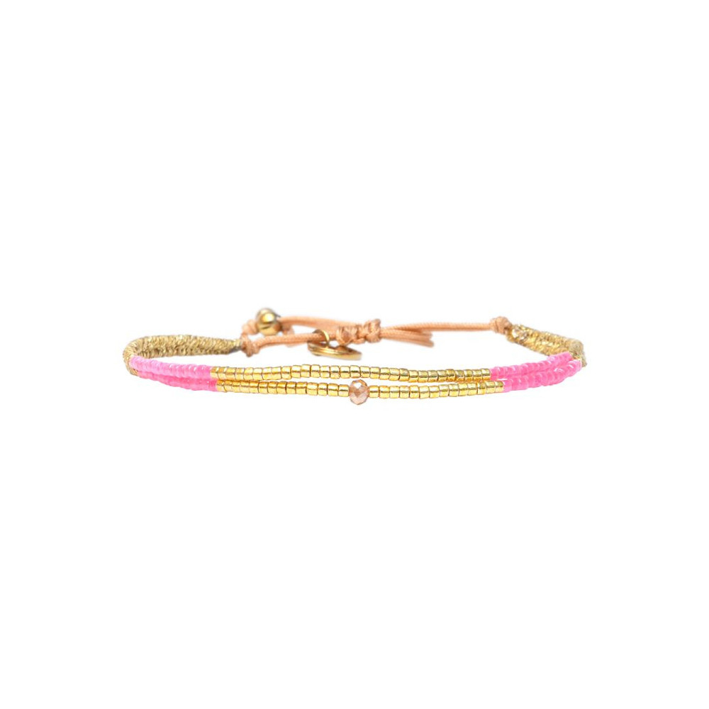 Bracelet Kiara composé de perles de miyuki dorées - rose fluo south beach - cristal nectarine. Bracelet entièrement confectionné à la main de manière artisanale. Fermoir lien coulissant, ajustable à tous les poignet (14 à 24 cm). Chaque bijou de la marque est livré dans un pochon spécifique.