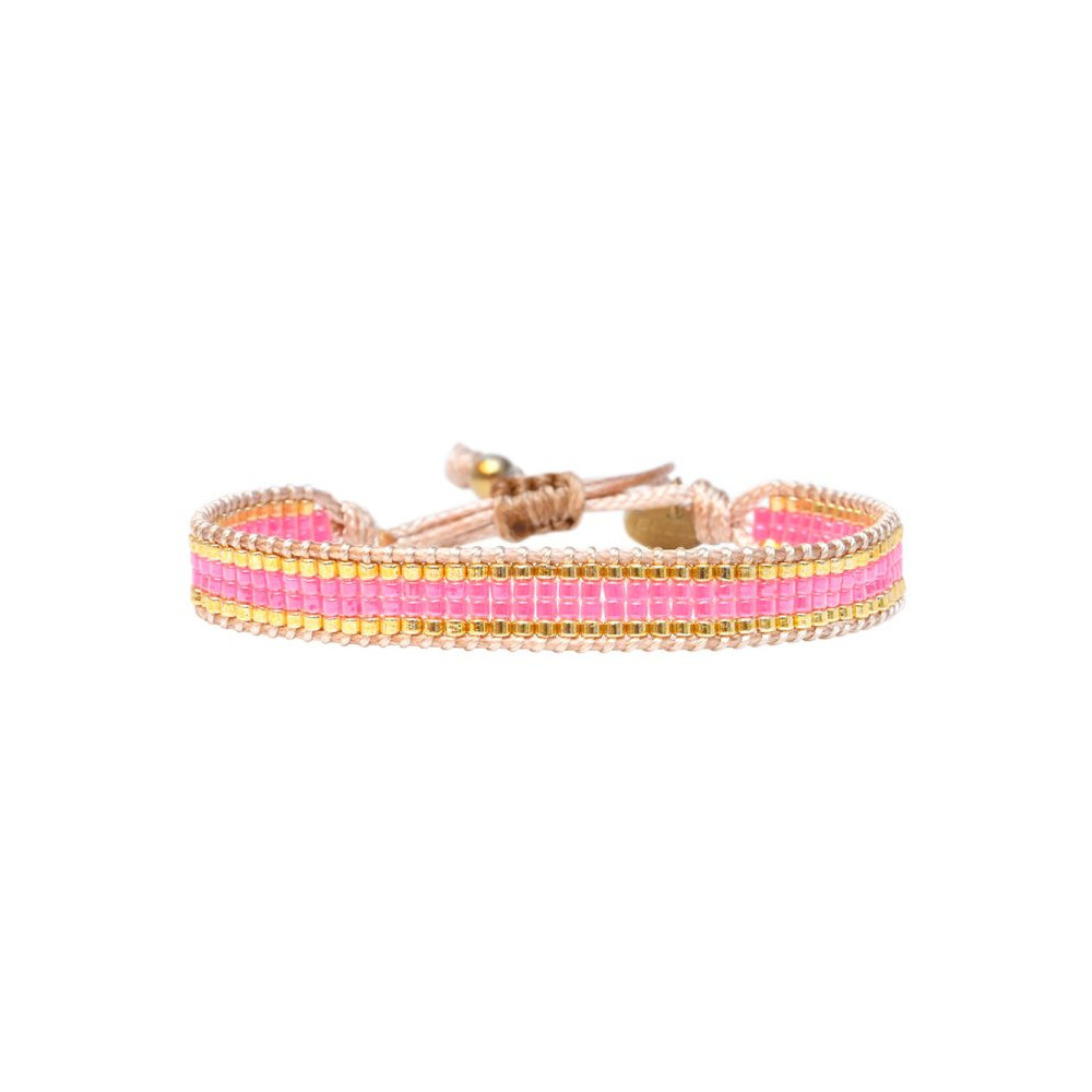 Bracelet Assia composé de perles de miyuki dorées - rose fluo south beach. Bracelet entièrement confectionné à la main de manière artisanale. Fermoir lien coulissant, ajustable à tous les poignet (14 à 24 cm). Chaque bijou de la marque est livré dans un pochon spécifique.
