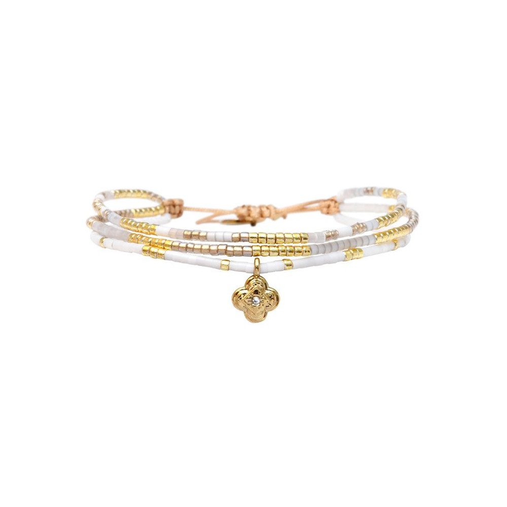 Bracelet Anamé composé de perles de miyuki dorées - blanc de soie laiteux ou milky white silk - blanc chaud - blanc soie de pêche - cristal lustré doublé d'or. Bracelet entièrement confectionné à la main de manière artisanale. Fermoir lien coulissant, ajustable à tous les poignet (14 à 24 cm). Chaque bijou de la marque est livré dans un pochon spécifique.