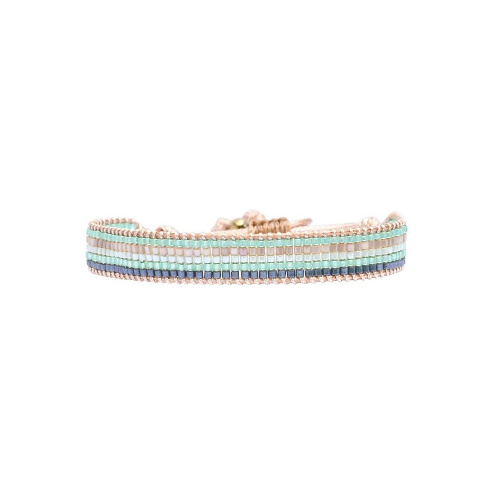 Bracelet Sunset Love composé de perles de miyuki dorées - vert d'eau - bleu délicat pastel - émeraude lustré - blanc soie de pêche. Bracelet entièrement confectionné à la main de manière artisanale. Fermoir lien coulissant, ajustable à tous les poignet (14 à 24 cm). Chaque bijou de la marque est livré dans un pochon spécifique.