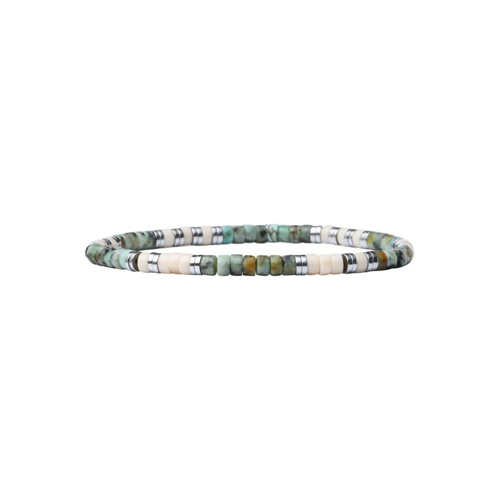 Le Bracelet Leo, monté sur un élastique ultra résistant, est composé d' hématites argentées, turquoise africaine et pierre de rivière.Pour tous les poignet (16 à 20 cm). Chaque bijou de la marque est livré dans un pochon spécifique.