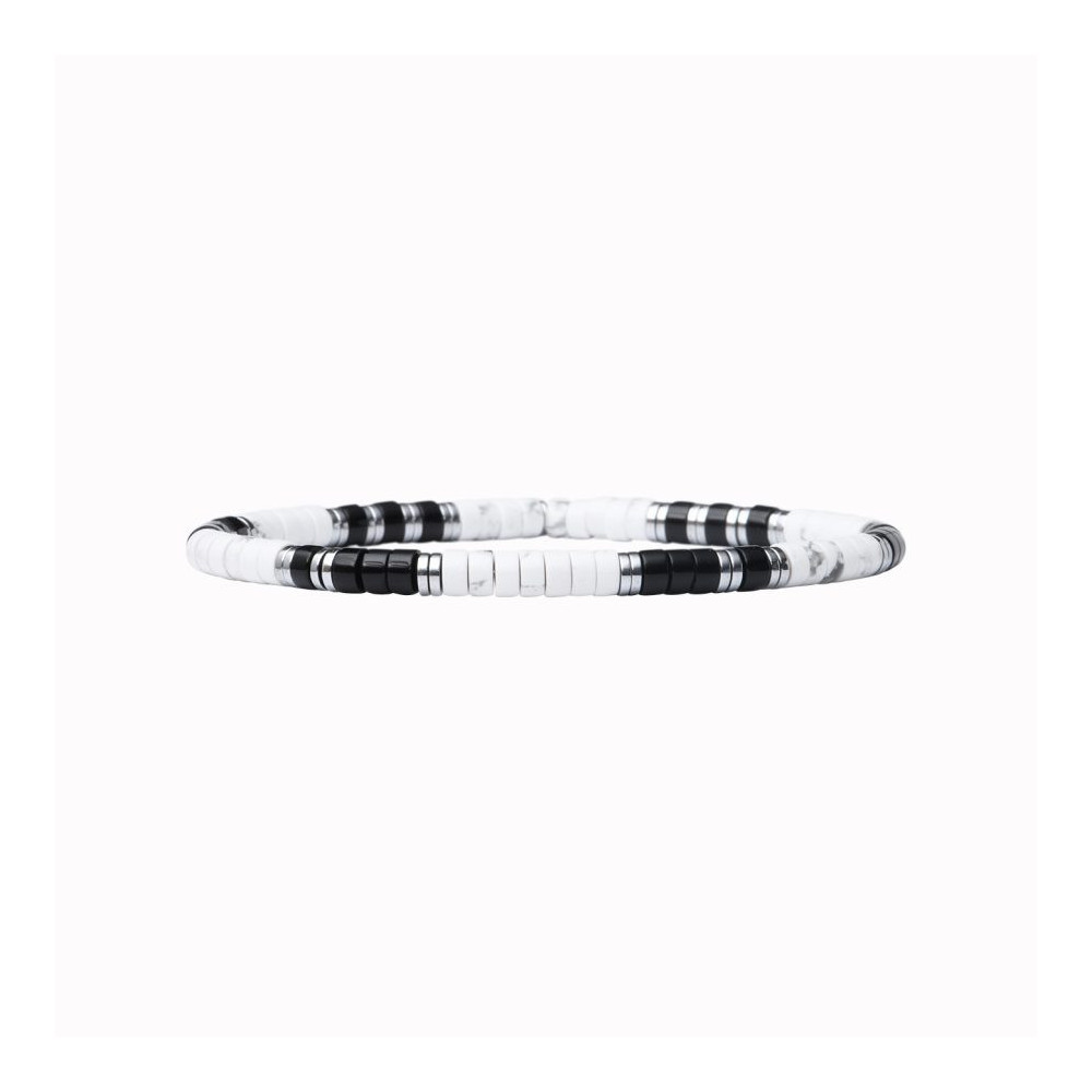Le Bracelet Leo, monté sur un élastique ultra résistant, est composé d' hématites argentées, howlite et onyx.Pour tous les poignet (16 à 20 cm). Chaque bijou de la marque est livré dans un pochon spécifique.