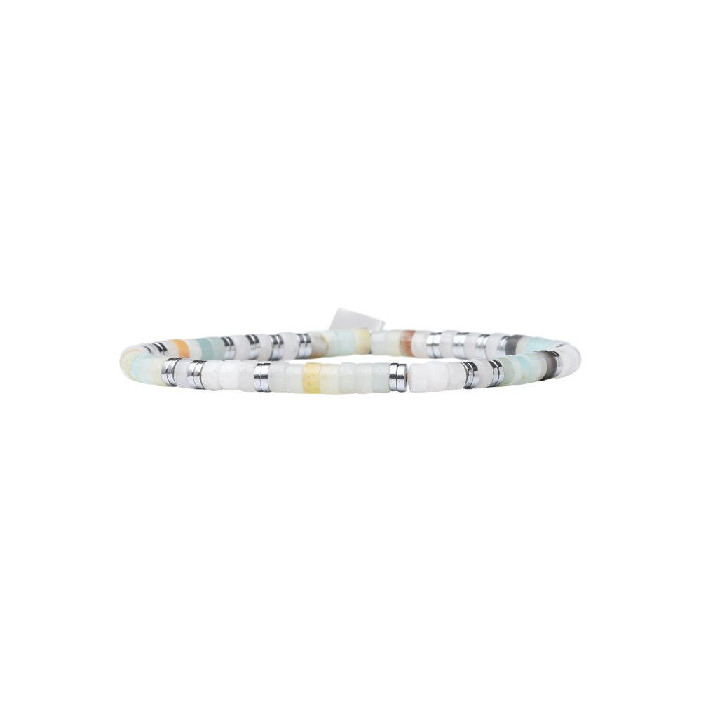 Le Bracelet Leo, monté sur un élastique ultra résistant, est composé d' hématites argentées, amazonite et quartz fumé.Pour tous les poignet (16 à 20 cm). Chaque bijou de la marque est livré dans un pochon spécifique.