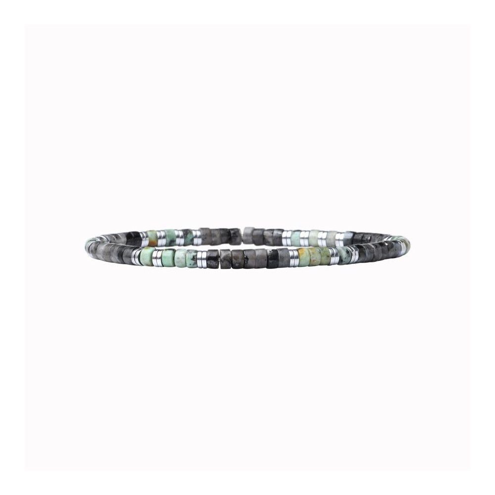 Le Bracelet Leo, monté sur un élastique ultra résistant, est composé d' hématites argentées, turquoise africaine et obsidienne.Pour tous les poignet (16 à 20 cm). Chaque bijou de la marque est livré dans un pochon spécifique.