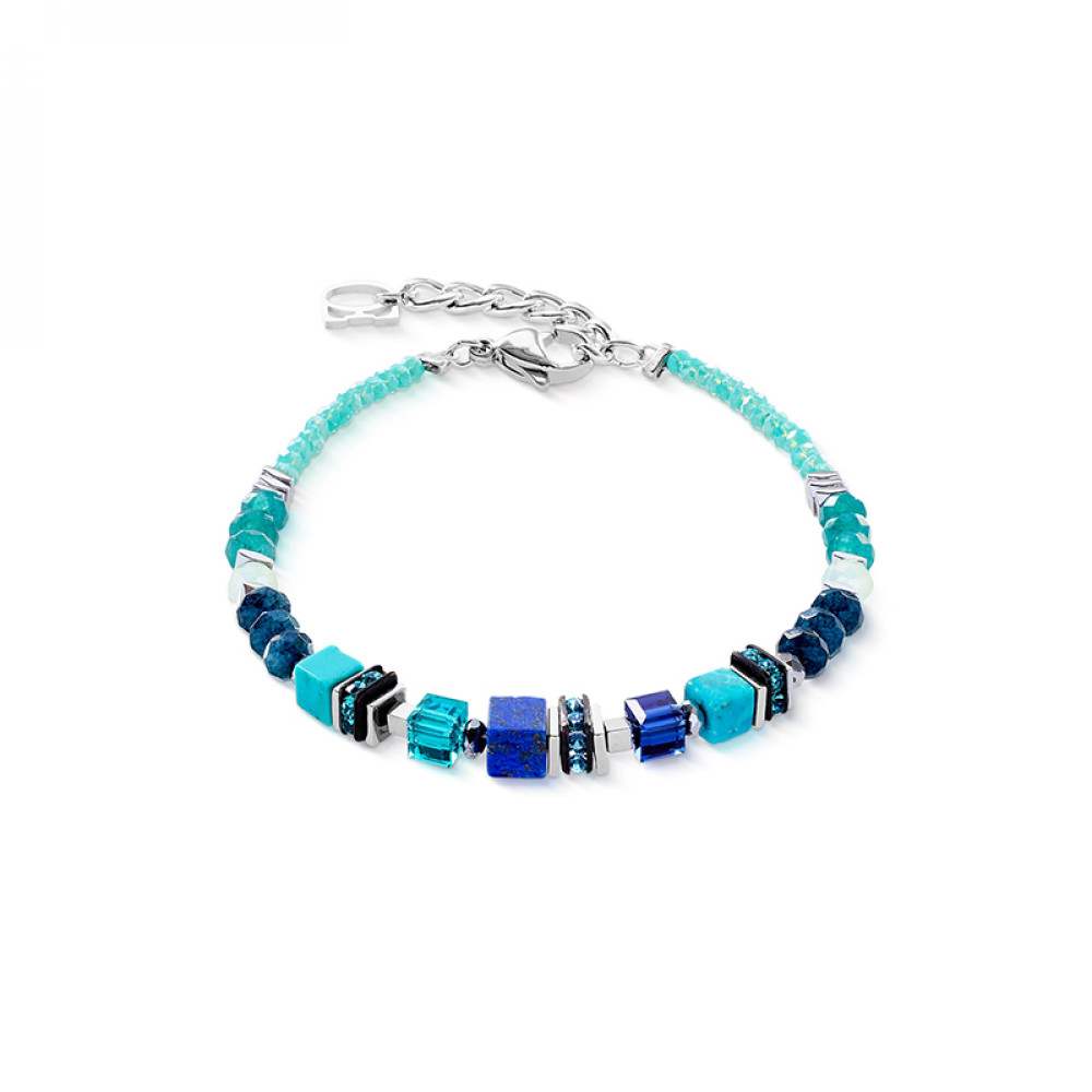 Nouveauté été 2026. Cristal de Swarovski® Lapis Lazulli Turquoise Jade colorée Hématite avec finition d'oxyde de titane Rondelles de Strass Verre taillé Acier inoxydable argenté LONGUEUR: 18 cm + 3 cm chaîne d'extension Fermoir en acier inoxydable argenté. Chaque bijou de la marque est livré dans un écrin spécifique griffé Cœur de lion.