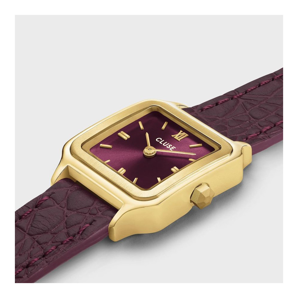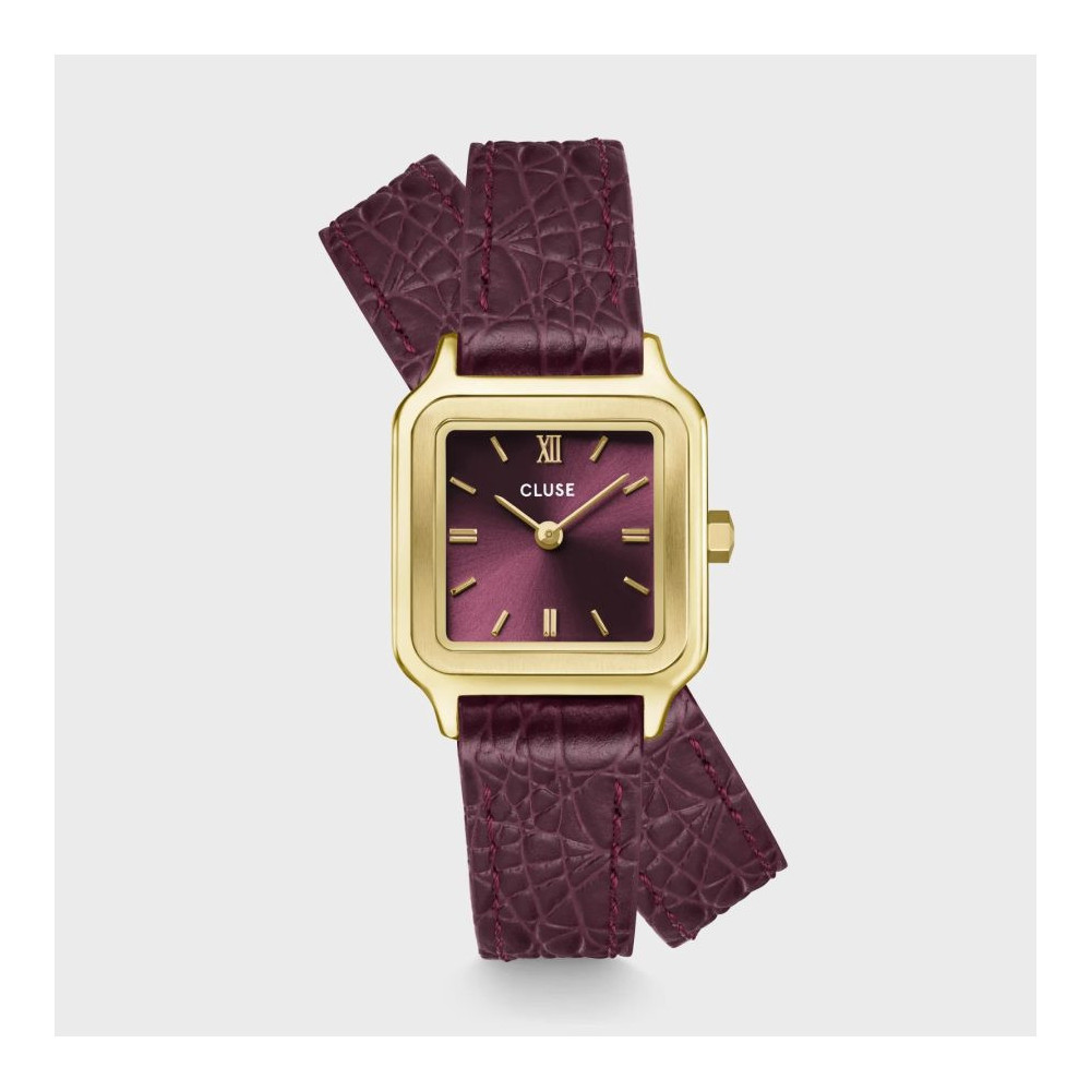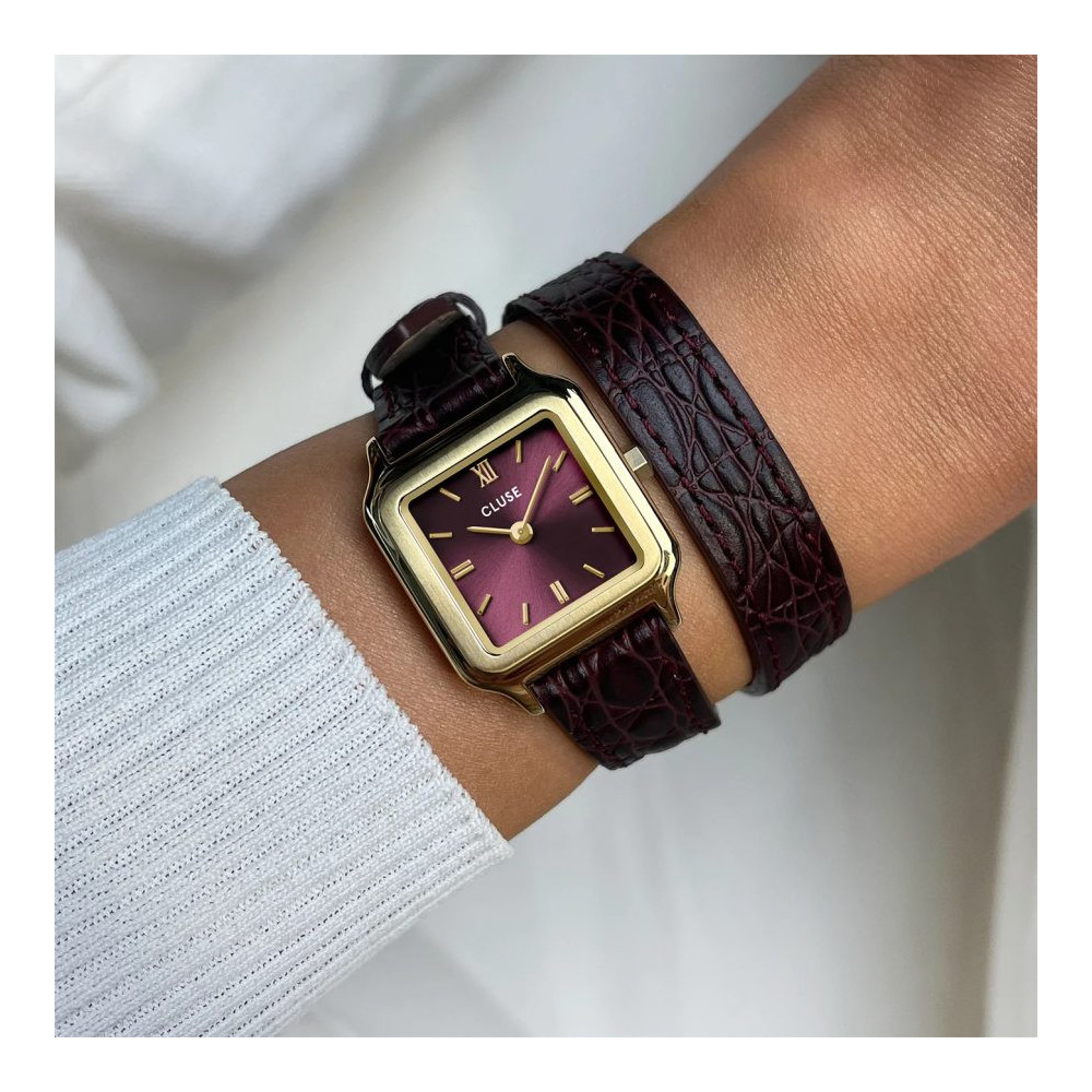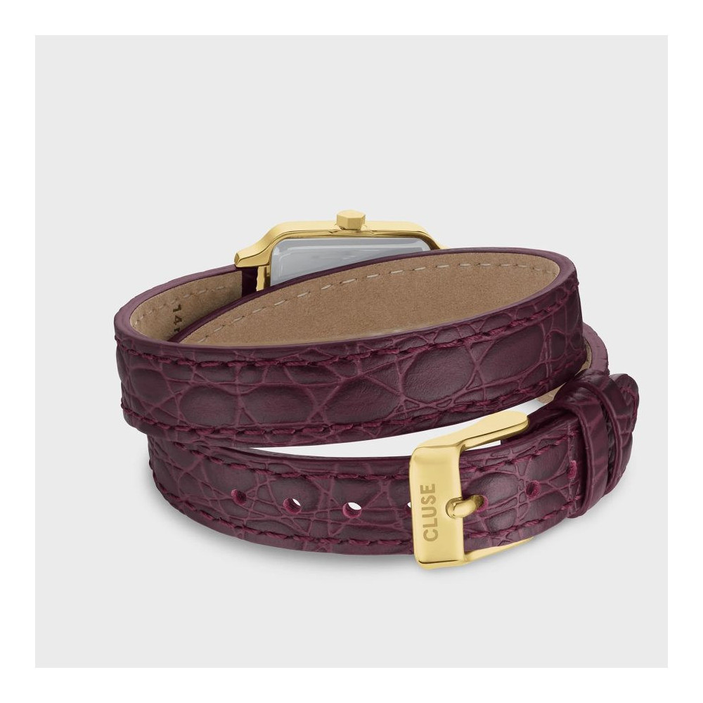 Gracieuse Petite Watch Double Crocodile Leather, Wine, Gold Colour . Chaque montre est livrée dans un écrin spécifique griffé Cluse.