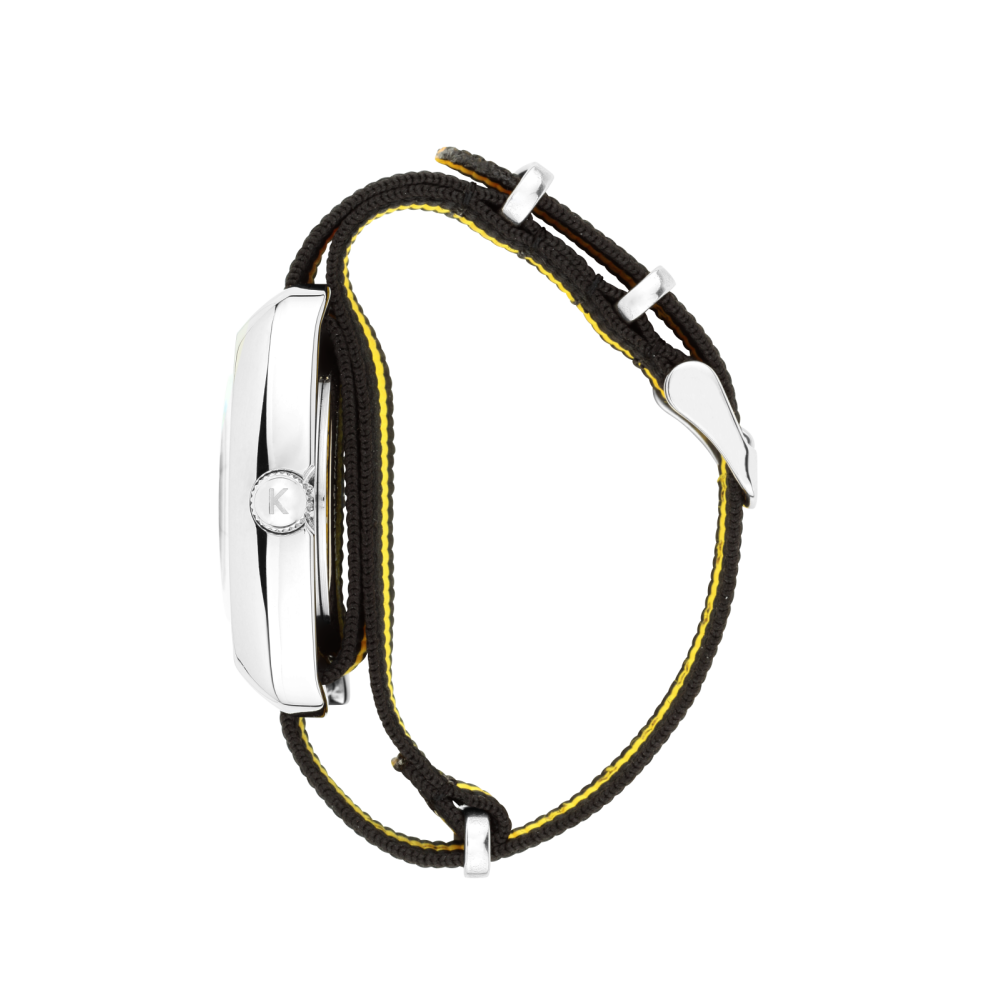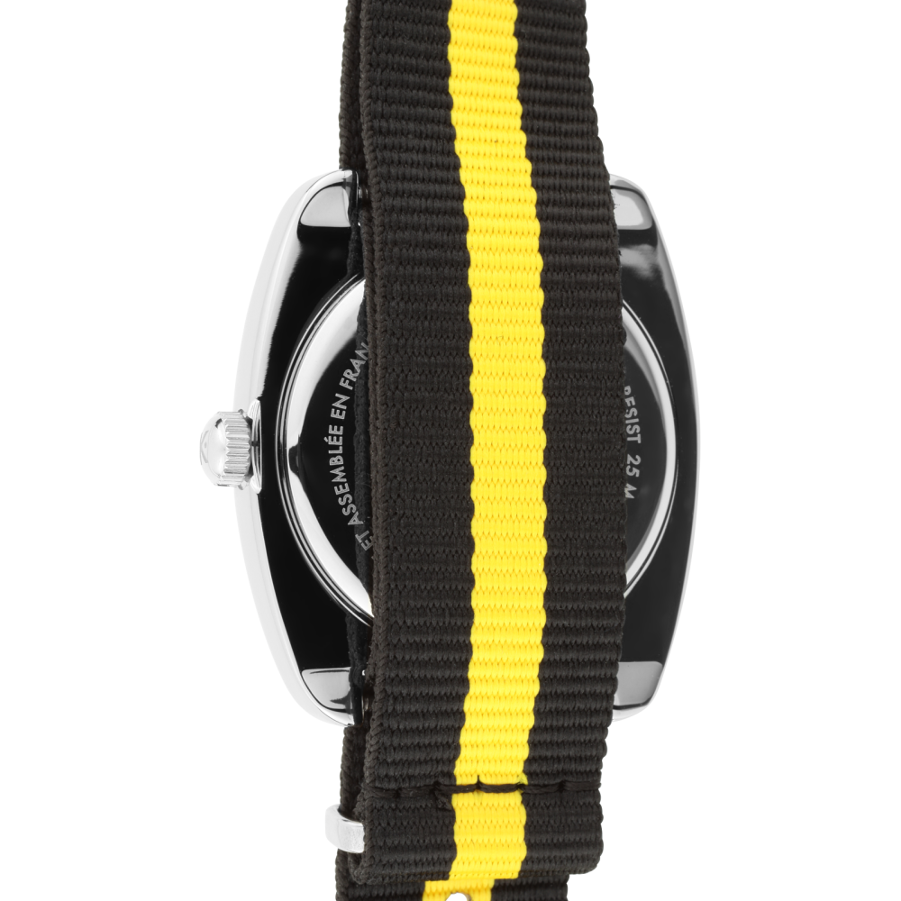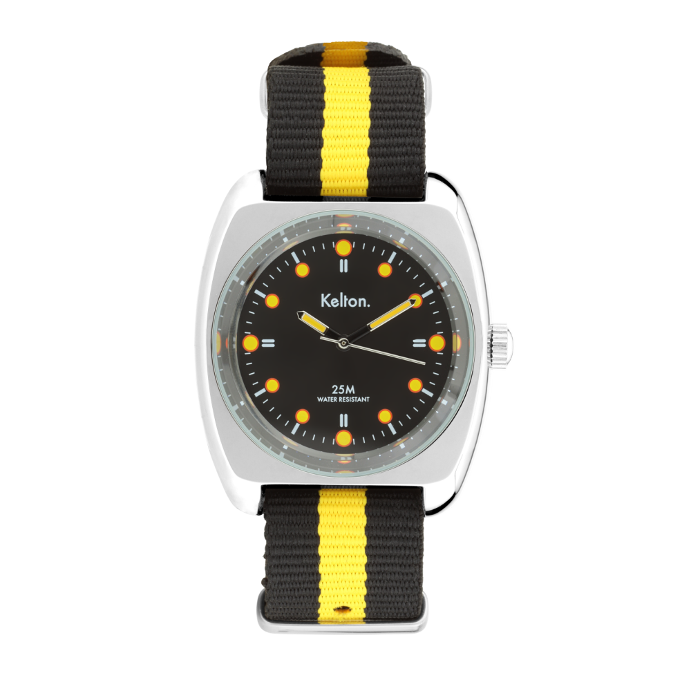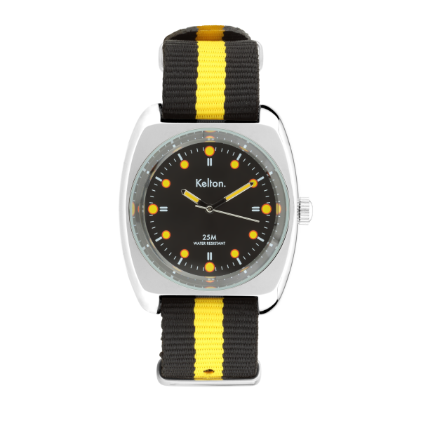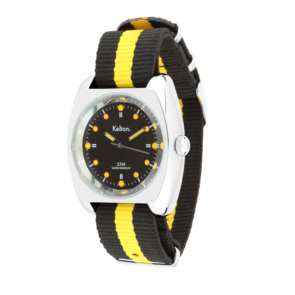Montre RC2 Nato noir jaune. Montre conçue et assemblée en France. Chaque Montre Kelton est livrée dans son écrin spécifique griffé au nom de la marque.