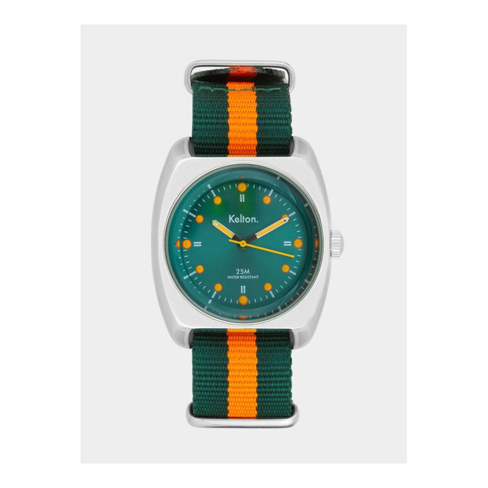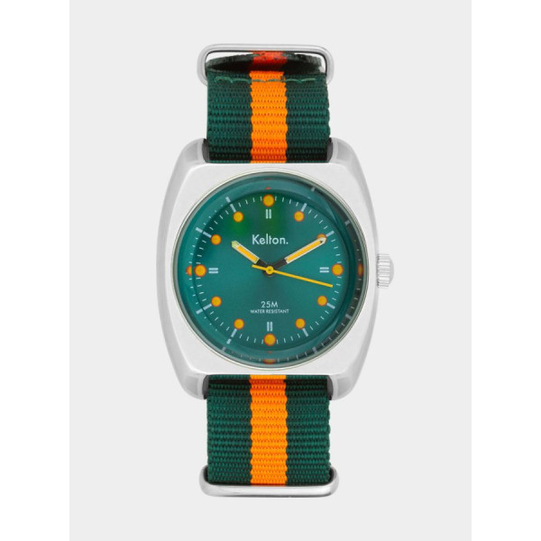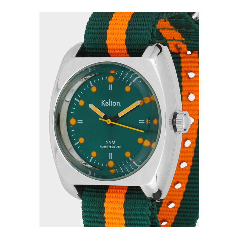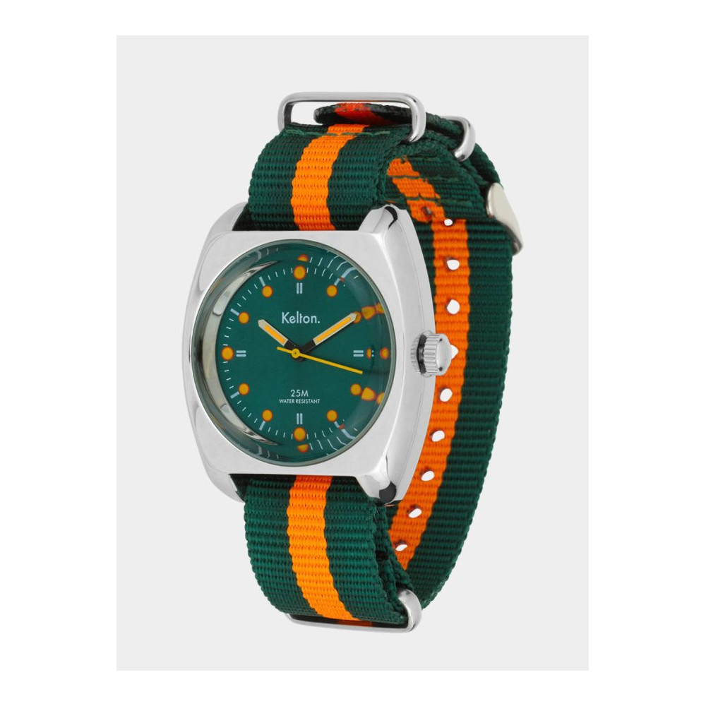 Montre RC2 Nato vert-orange . Montre conçue et assemblée en France. Chaque Montre Kelton est livrée dans son écrin spécifique griffé au nom de la marque.
