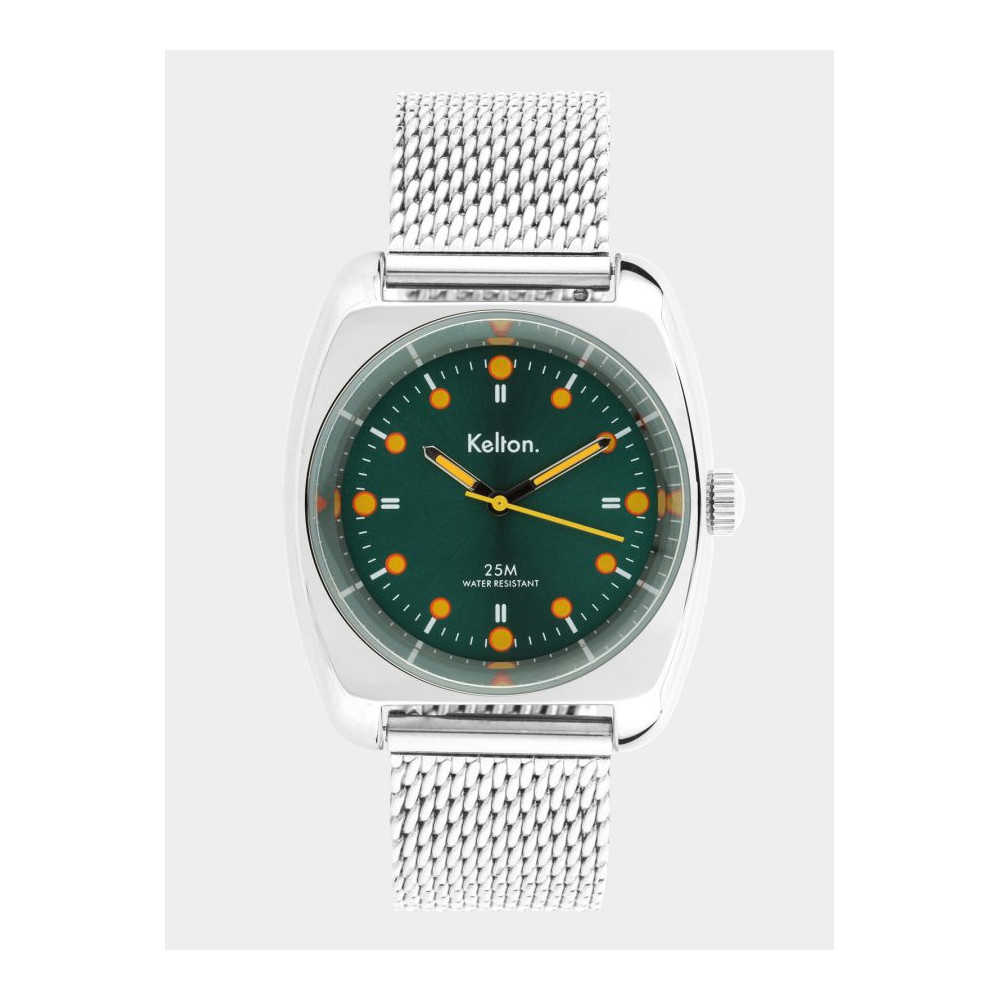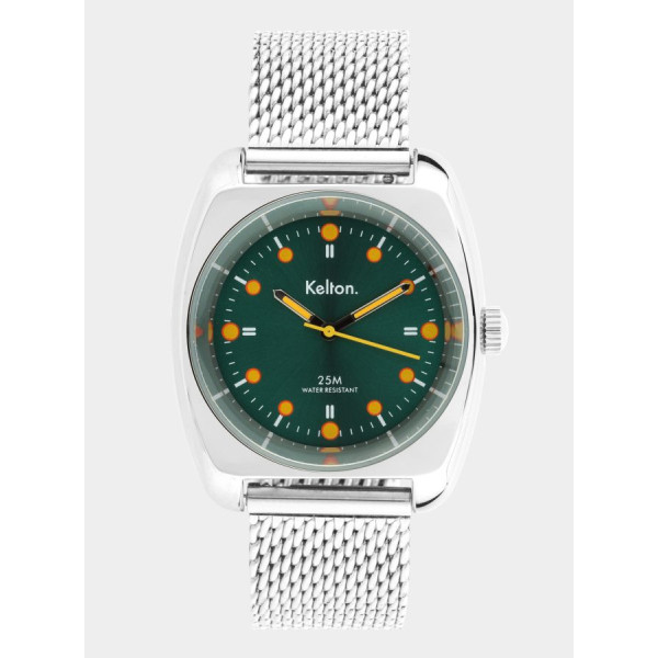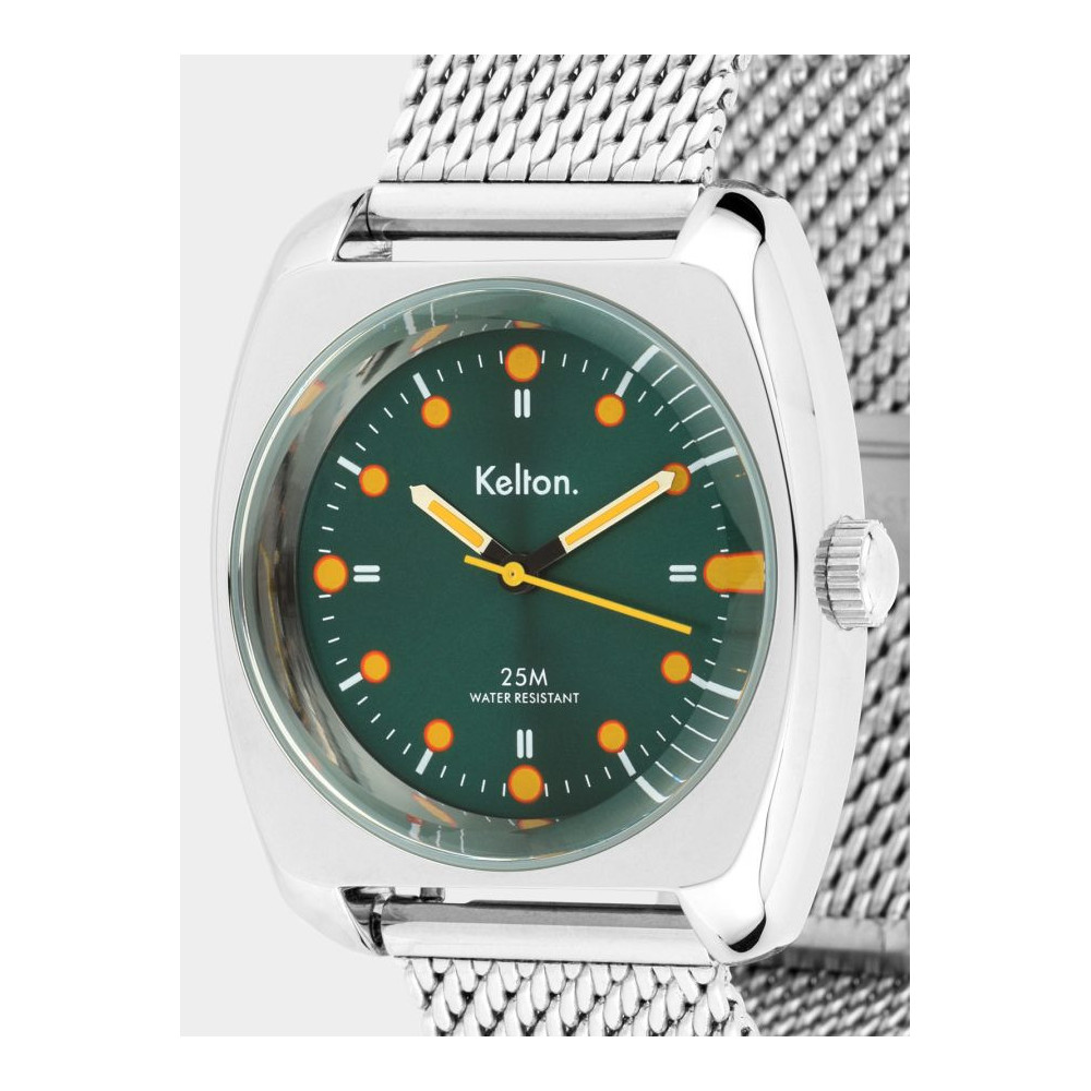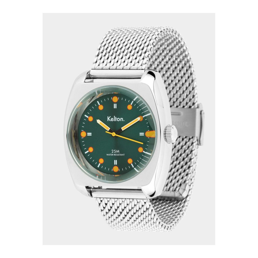 Montre RC2 vert-orange Mesh . Montre conçue et assemblée en France. Chaque Montre Kelton est livrée dans son écrin spécifique griffé au nom de la marque.