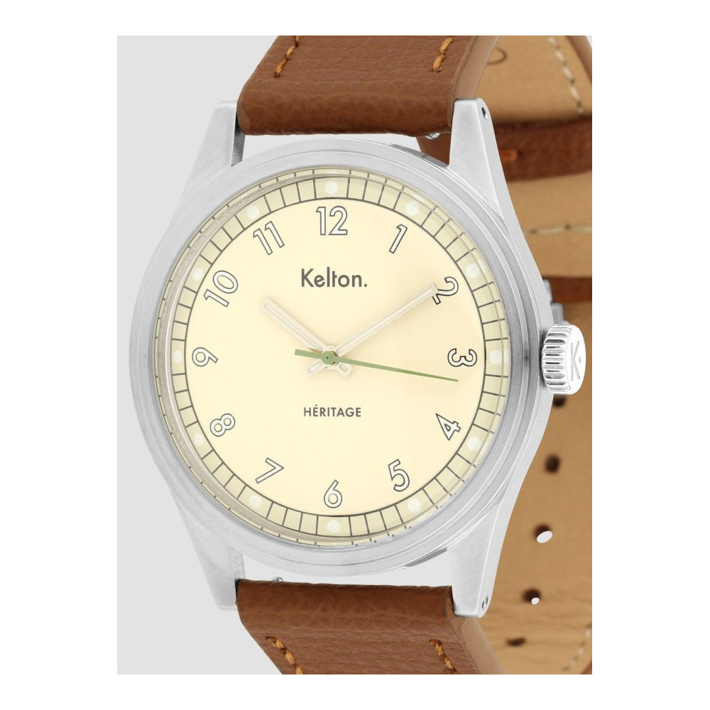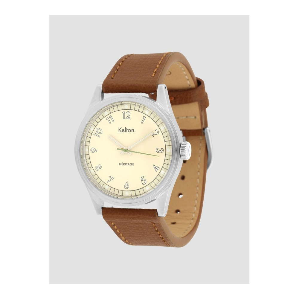 Montre Héritage Champagne Epsom Camel en Acier, bracelet Cuir, pour Mixte de la marque Kelton Réf. 9126142, collection Héritage. Montre conçue et assemblée en France. Chaque Montre Kelton est livrée dans son écrin spécifique griffé au nom de la marque.