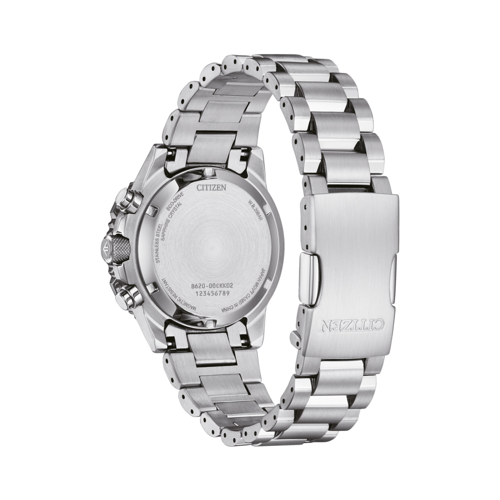 En plus de cela, il dispose d'un verre saphir résistant aux rayures et traité anti-reflet, d'une résistance magnétique jusqu'à 4800 A/m, et d'une étanchéité jusqu'à 20 bars (200 mètres). Le mouvement Eco-Drive fonctionne à l'énergie solaire et offre une réserve de marche de 9 mois à pleine charge. Le boîtier et le bracelet sont fabriqués en acier inoxydable.
