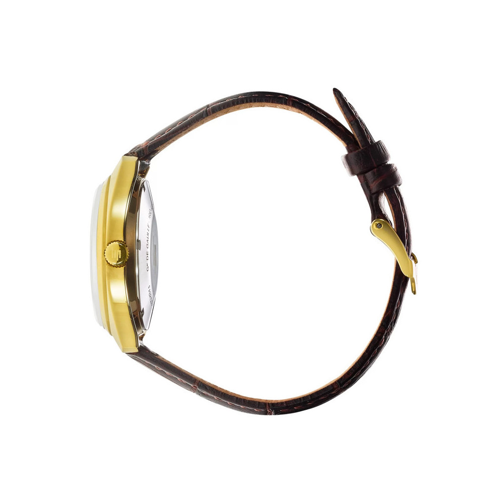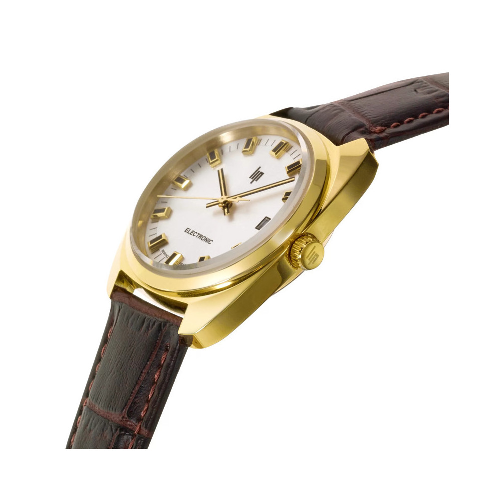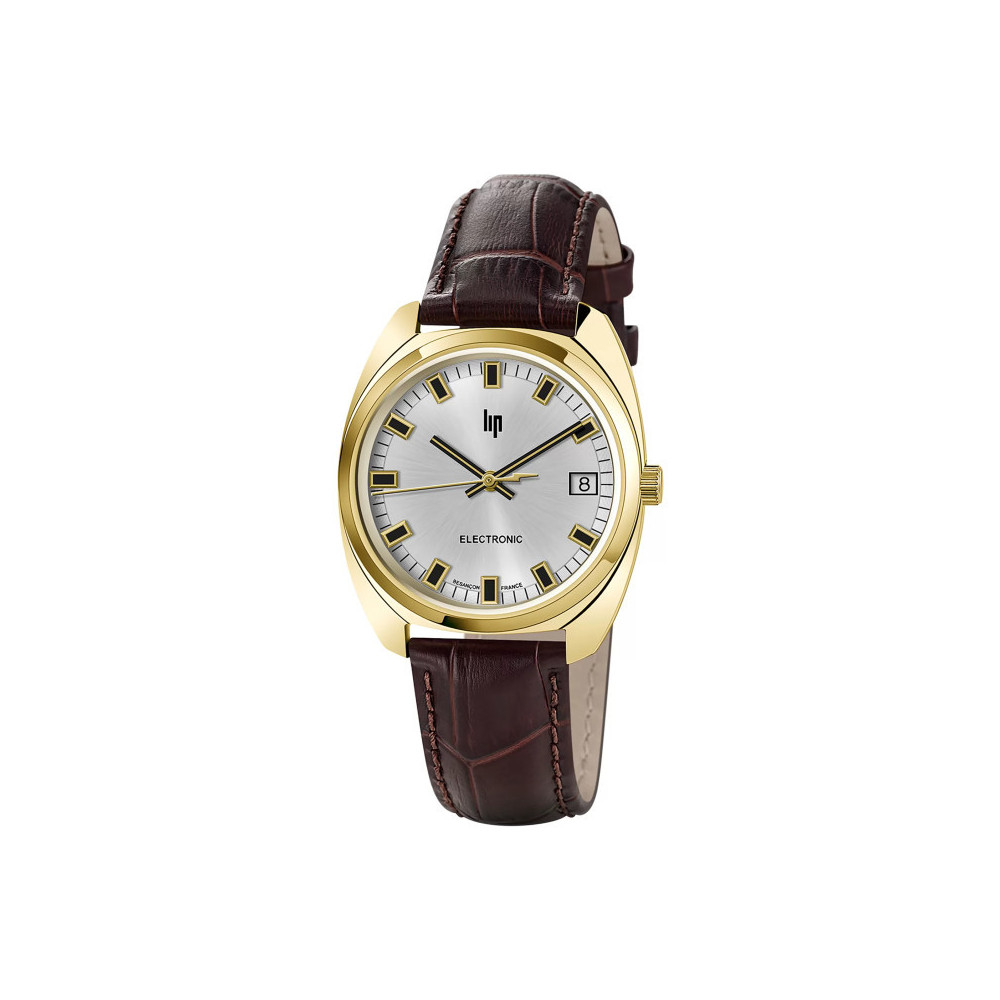 Cette montre LIP "Général de Gaulle" revisite un modèle emblématique dans un boîtier doré poli de 35 mm, sublimé par un cadran blanc soleillé aux reflets argentés. Son design minimaliste 3 aiguilles avec date se marie parfaitement à un bracelet cuir marron façon croco, raffiné et discret. Une montre iconique, à porter au quotidien ou pour les grandes occasions.