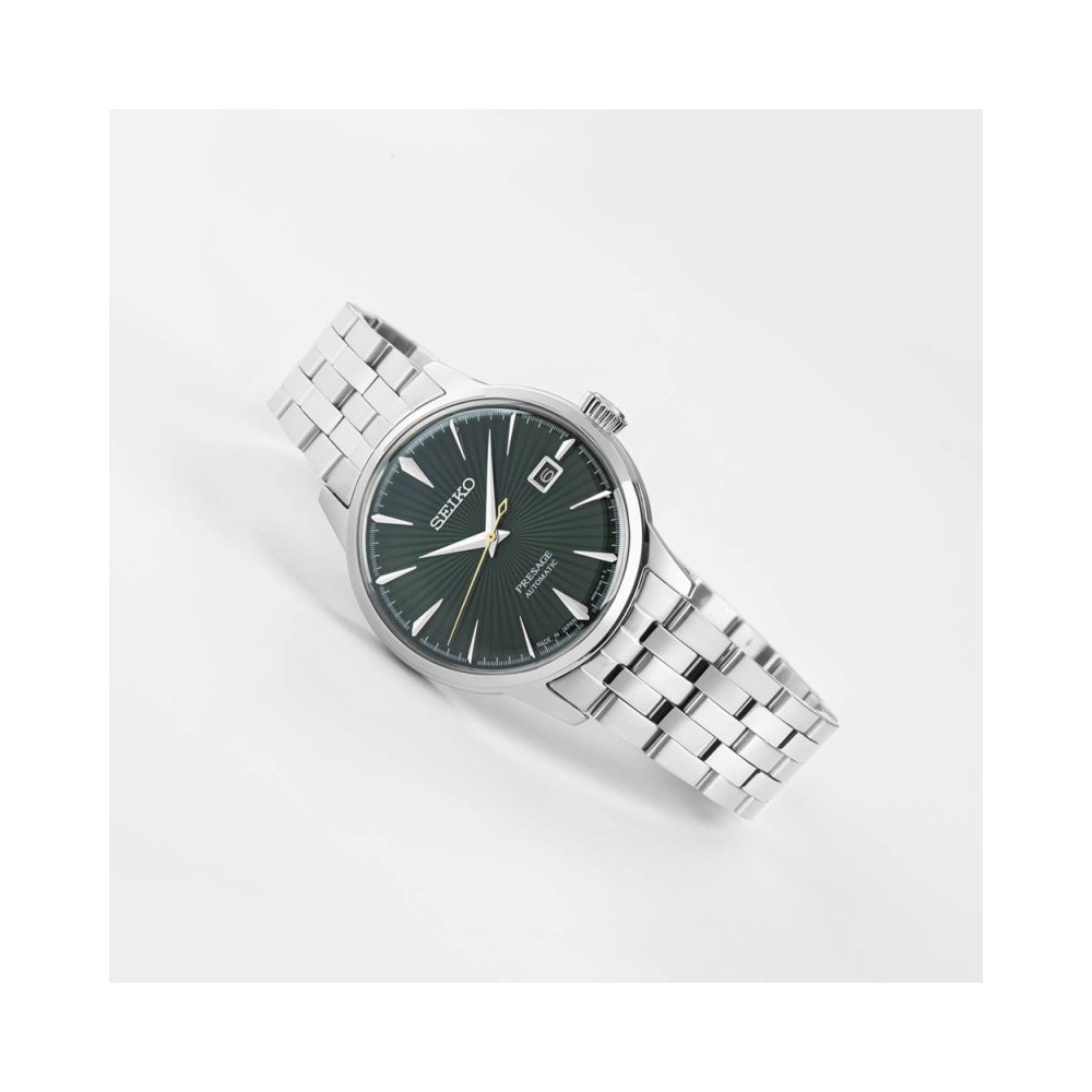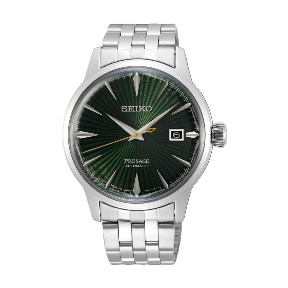 Les modèles de la collection Presage Cocktail se distinguent par leur cadran à effet rayonnant. La teinte verte de ce modèle fait écho au Mockingbird, un cocktail mêlant tequila, liqueur de menthe et citron vert. Réalisée entièrement en acier inoxydable et dotée d’un boîtier de 40,5 mm, cette montre automatique allie style et polyvalence pour s’adapter à toutes les occasions.