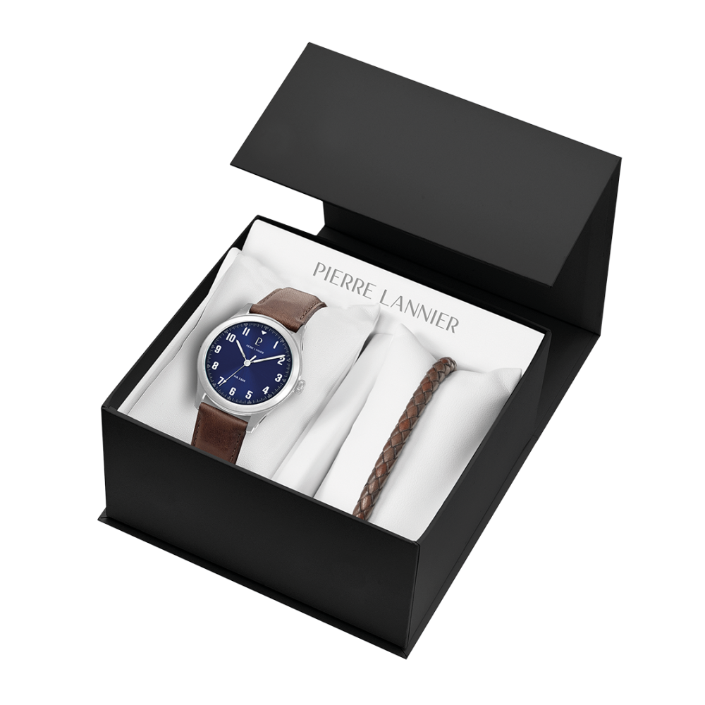 Coffret AVIATEUR argenté cuir. Chaque montre est livrée dans un écrin spécifique griffé au nom de Pierre Lannier et bénéficie d'une garantie internationale de 2 ans. Montre fabriquée avec beaucoup d'amour en France (67 - Bas Rhin).