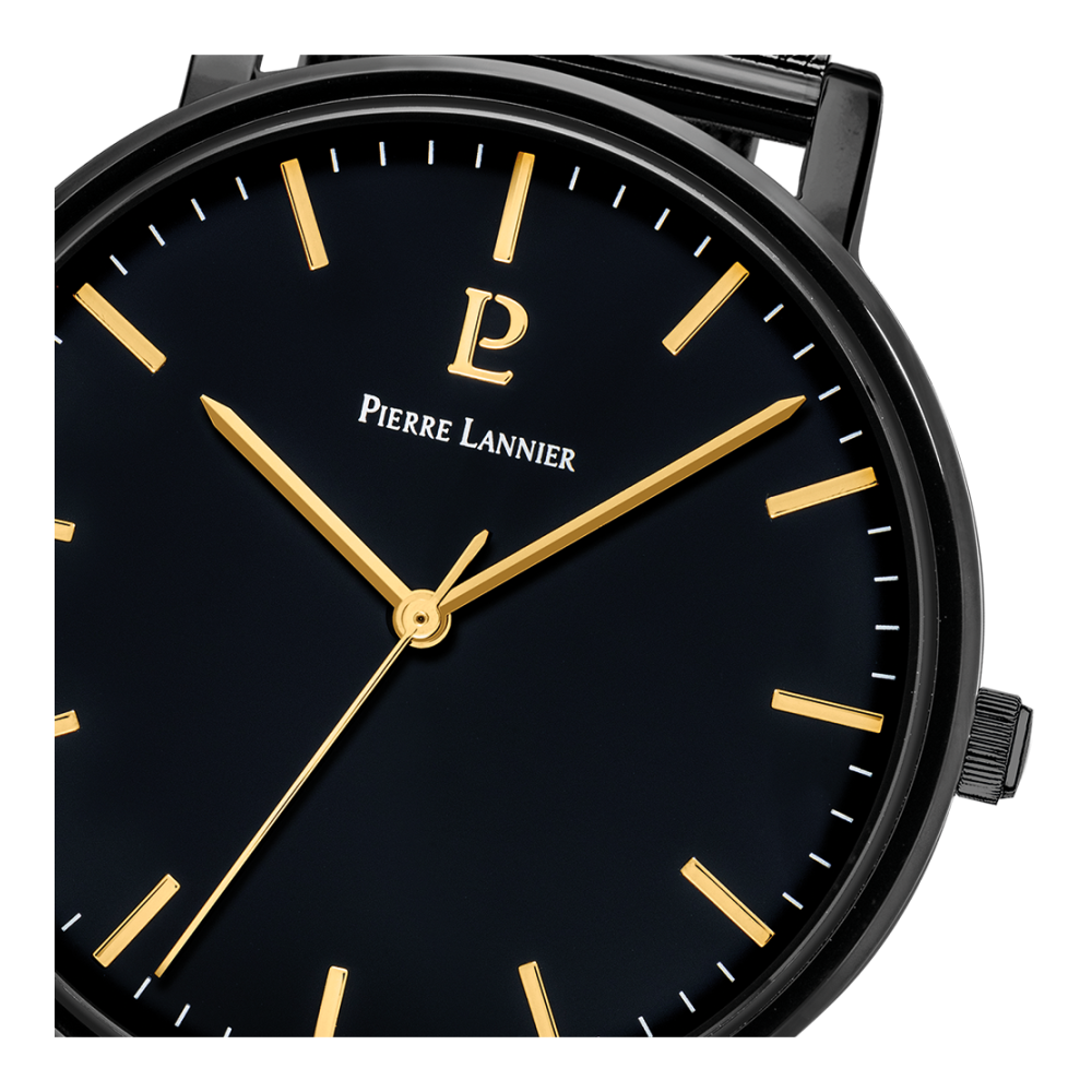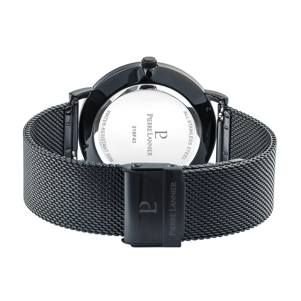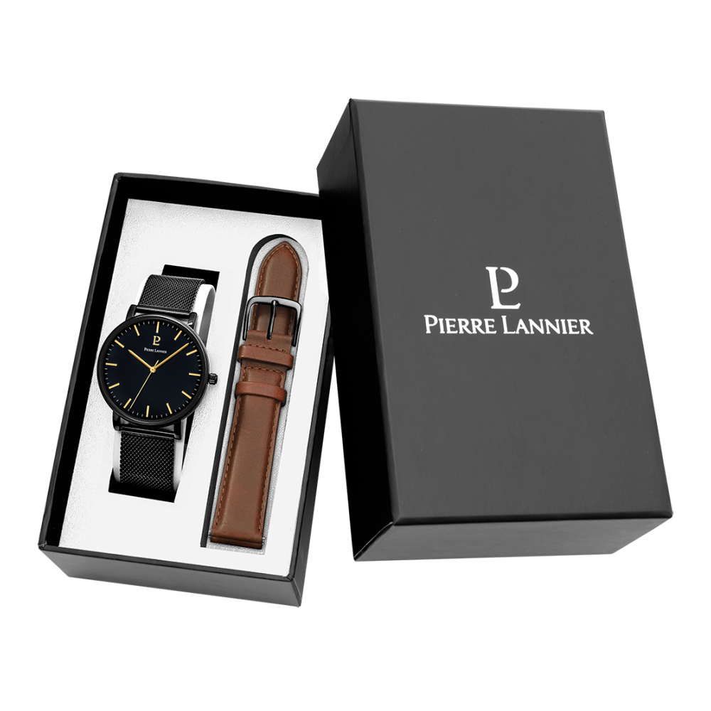 Coffret ESSENTIAL noir milanais. Chaque montre est livrée dans un écrin spécifique griffé au nom de Pierre Lannier et bénéficie d'une garantie internationale de 2 ans. Montre fabriquée avec beaucoup d'amour en France (67 - Bas Rhin).
