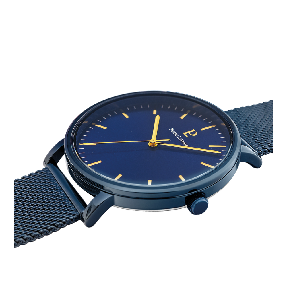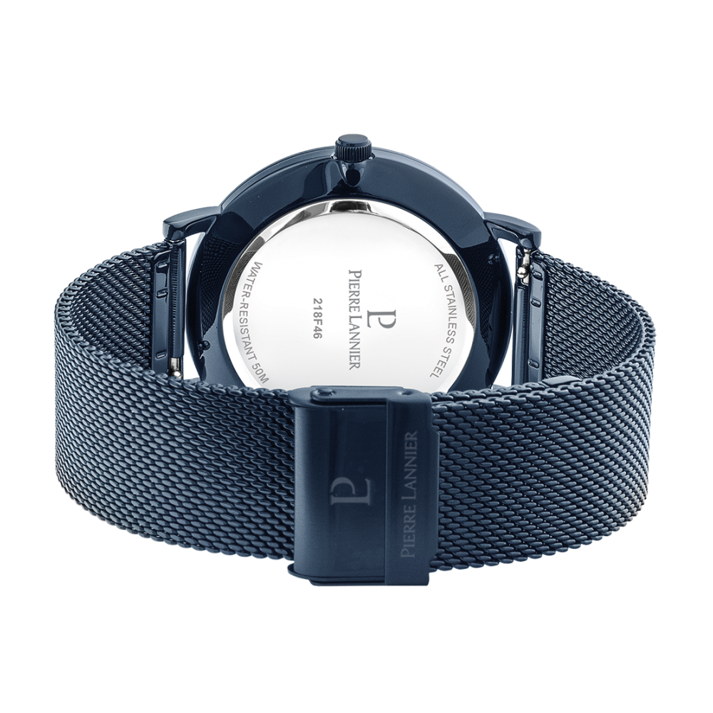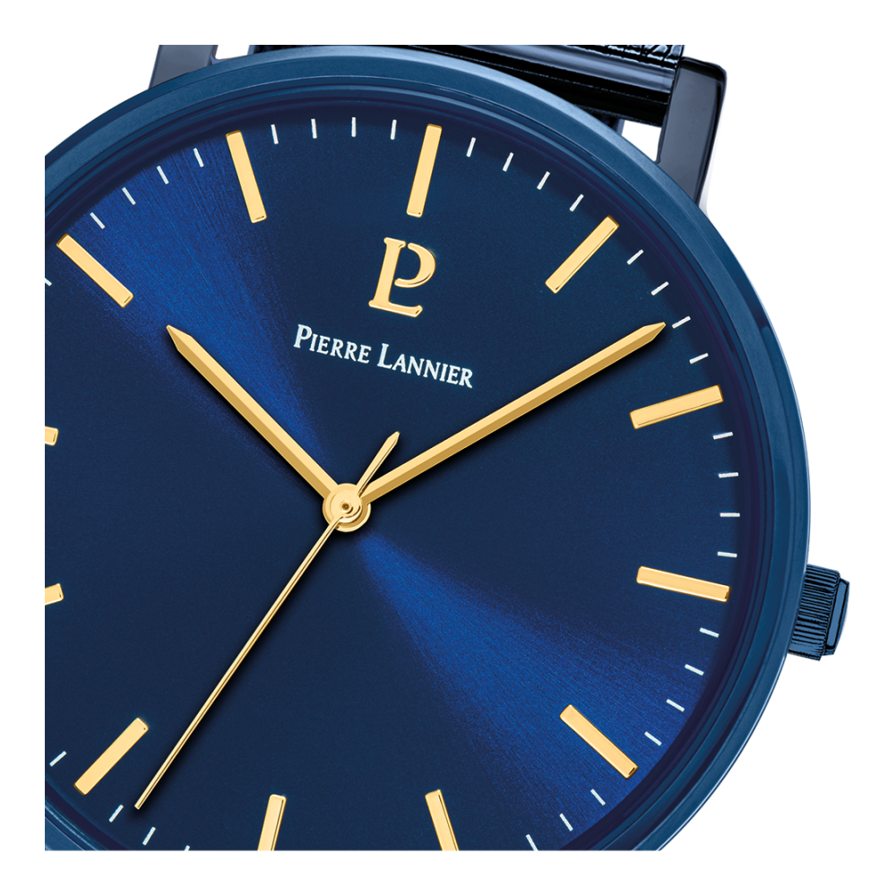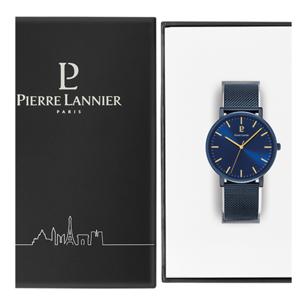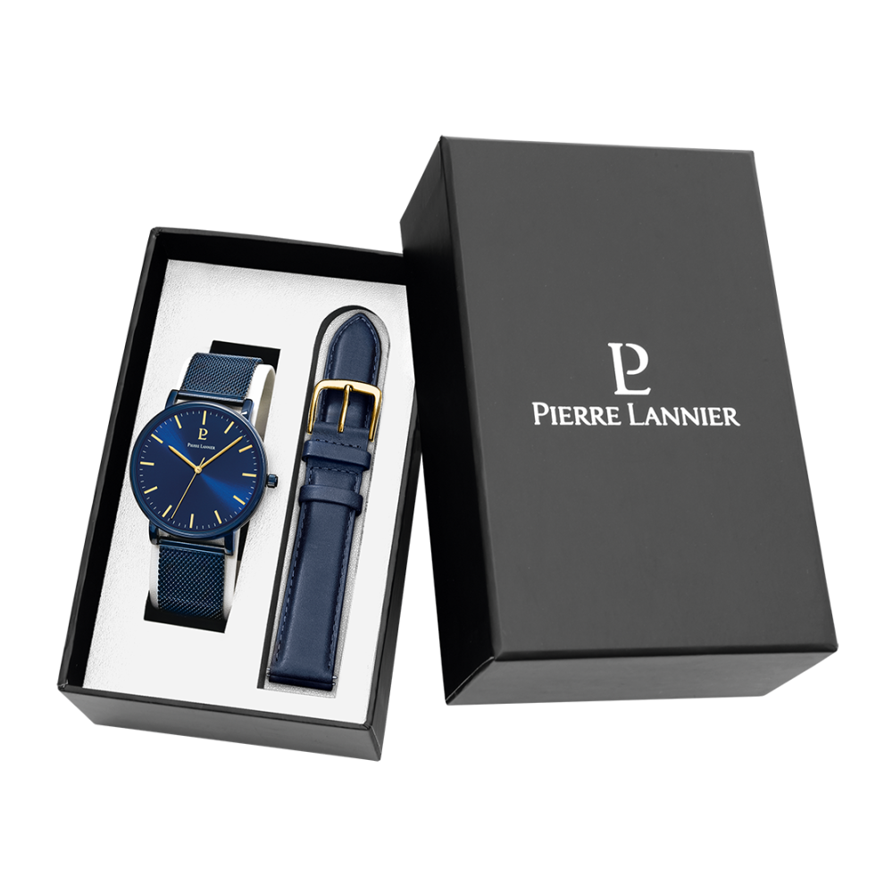 Coffret ESSENTIAL bleu milanais. Chaque montre est livrée dans un écrin spécifique griffé au nom de Pierre Lannier et bénéficie d'une garantie internationale de 2 ans. Montre fabriquée avec beaucoup d'amour en France (67 - Bas Rhin).