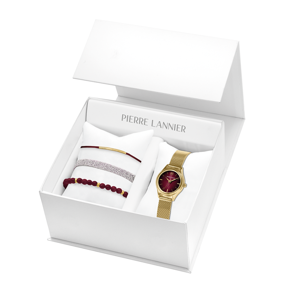 Coffret PYA doré métal et bijou. Chaque montre est livrée dans un écrin spécifique griffé au nom de Pierre Lannier et bénéficie d'une garantie internationale de 2 ans. Montre fabriquée avec beaucoup d'amour en France (67 - Bas Rhin).