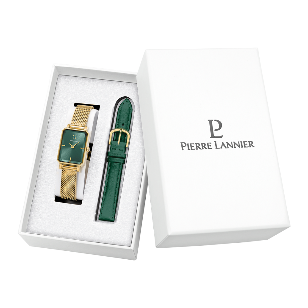 Coffret ARIANE doré milanais. Chaque montre est livrée dans un écrin spécifique griffé au nom de Pierre Lannier et bénéficie d'une garantie internationale de 2 ans. Montre fabriquée avec beaucoup d'amour en France (67 - Bas Rhin).