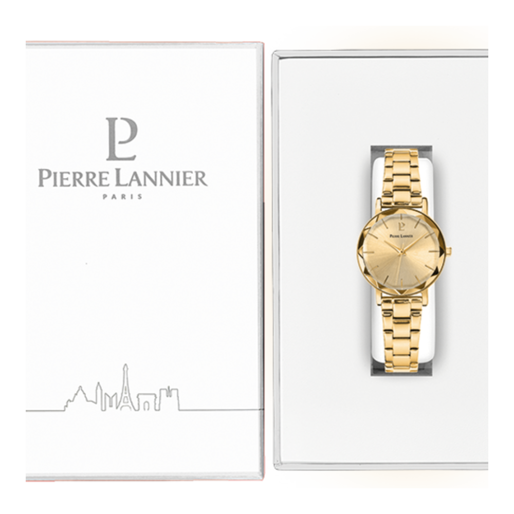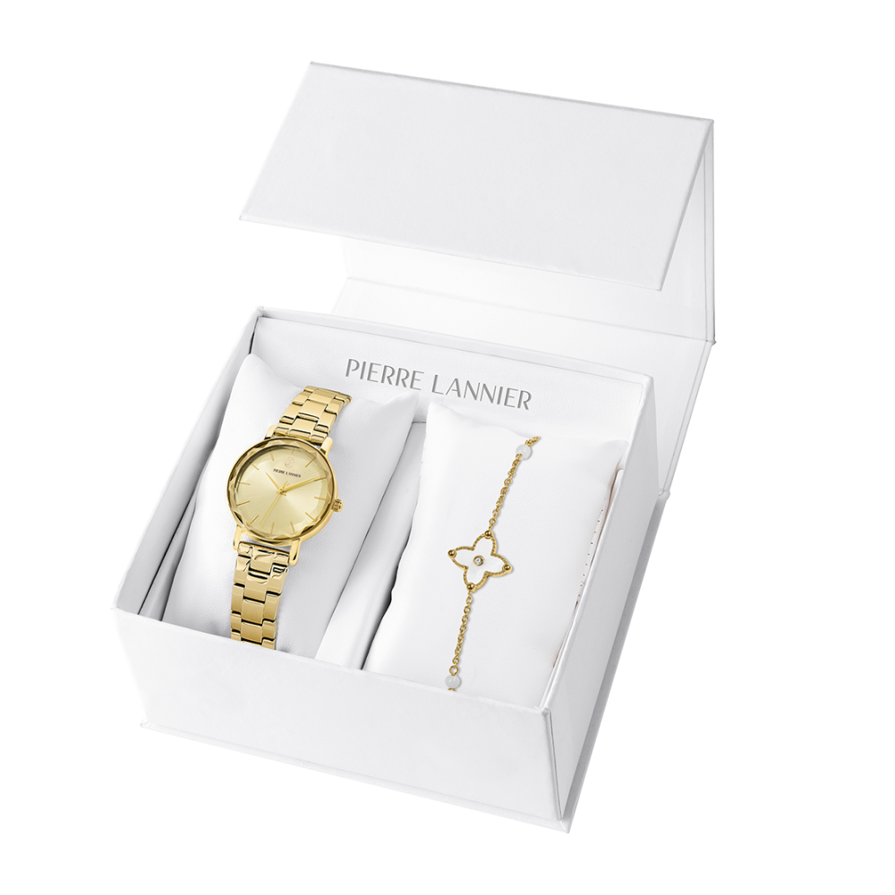 Coffret MULTIPLES doré métal. Chaque montre est livrée dans un écrin spécifique griffé au nom de Pierre Lannier et bénéficie d'une garantie internationale de 2 ans. Montre fabriquée avec beaucoup d'amour en France (67 - Bas Rhin).