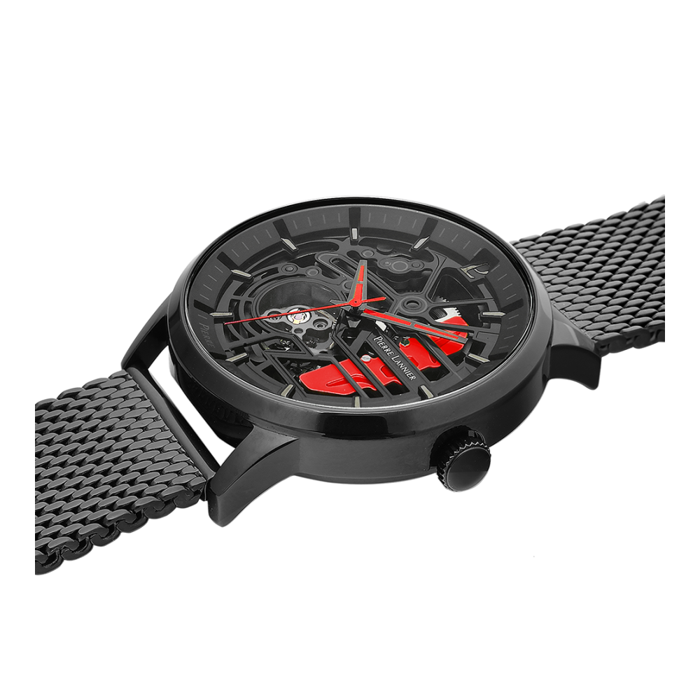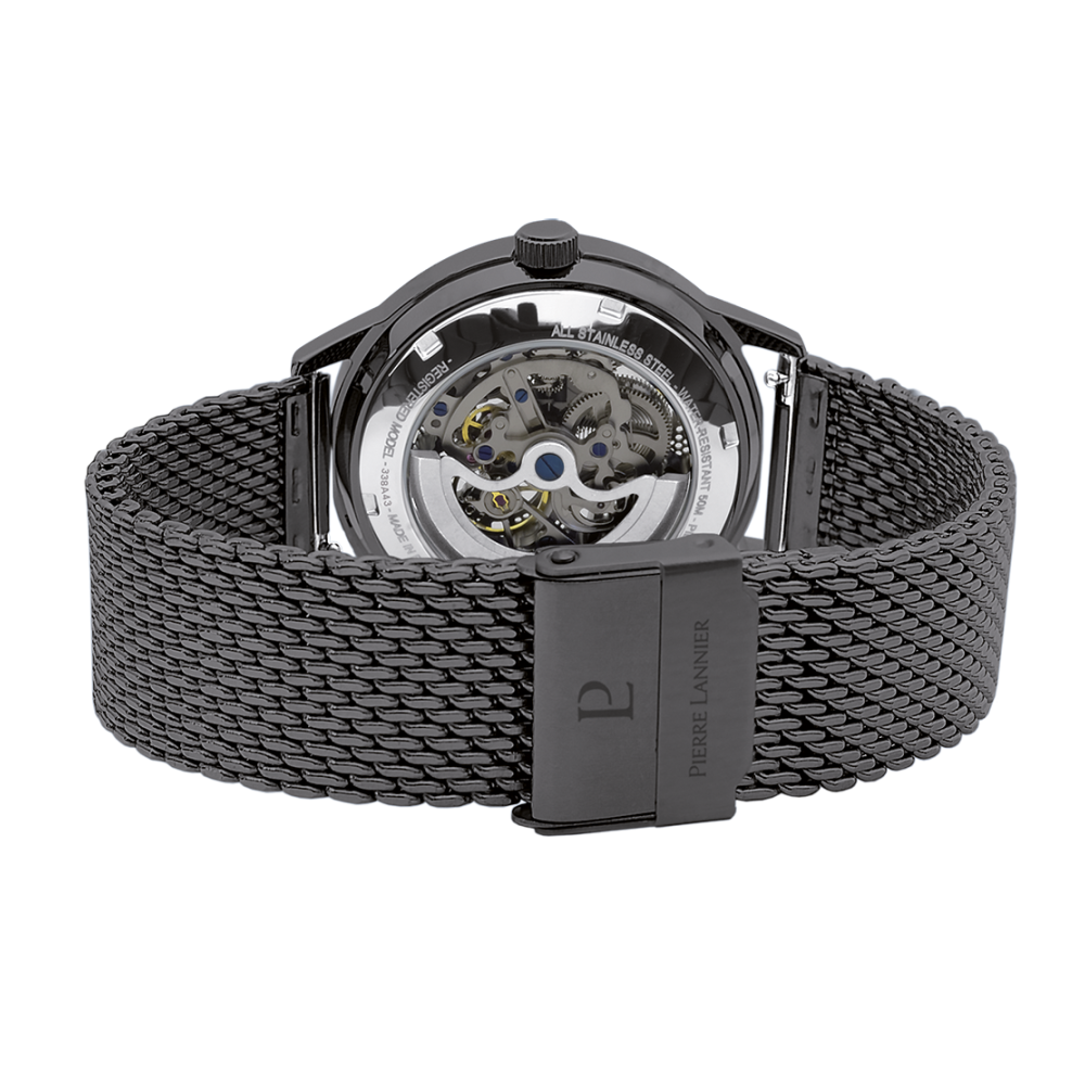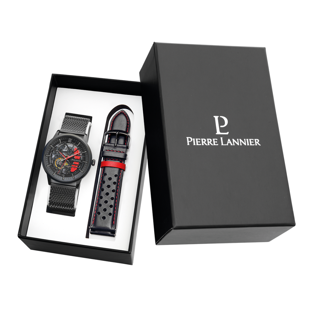 Coffret PADDOCK noir milanais. Chaque montre est livrée dans un écrin spécifique griffé au nom de Pierre Lannier et bénéficie d'une garantie internationale de 2 ans. Montre fabriquée avec beaucoup d'amour en France (67 - Bas Rhin).