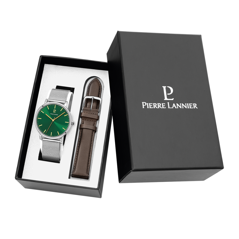 Coffret ESSENTIAL argenté milanais. Chaque montre est livrée dans un écrin spécifique griffé au nom de Pierre Lannier et bénéficie d'une garantie internationale de 2 ans. Montre fabriquée avec beaucoup d'amour en France (67 - Bas Rhin).